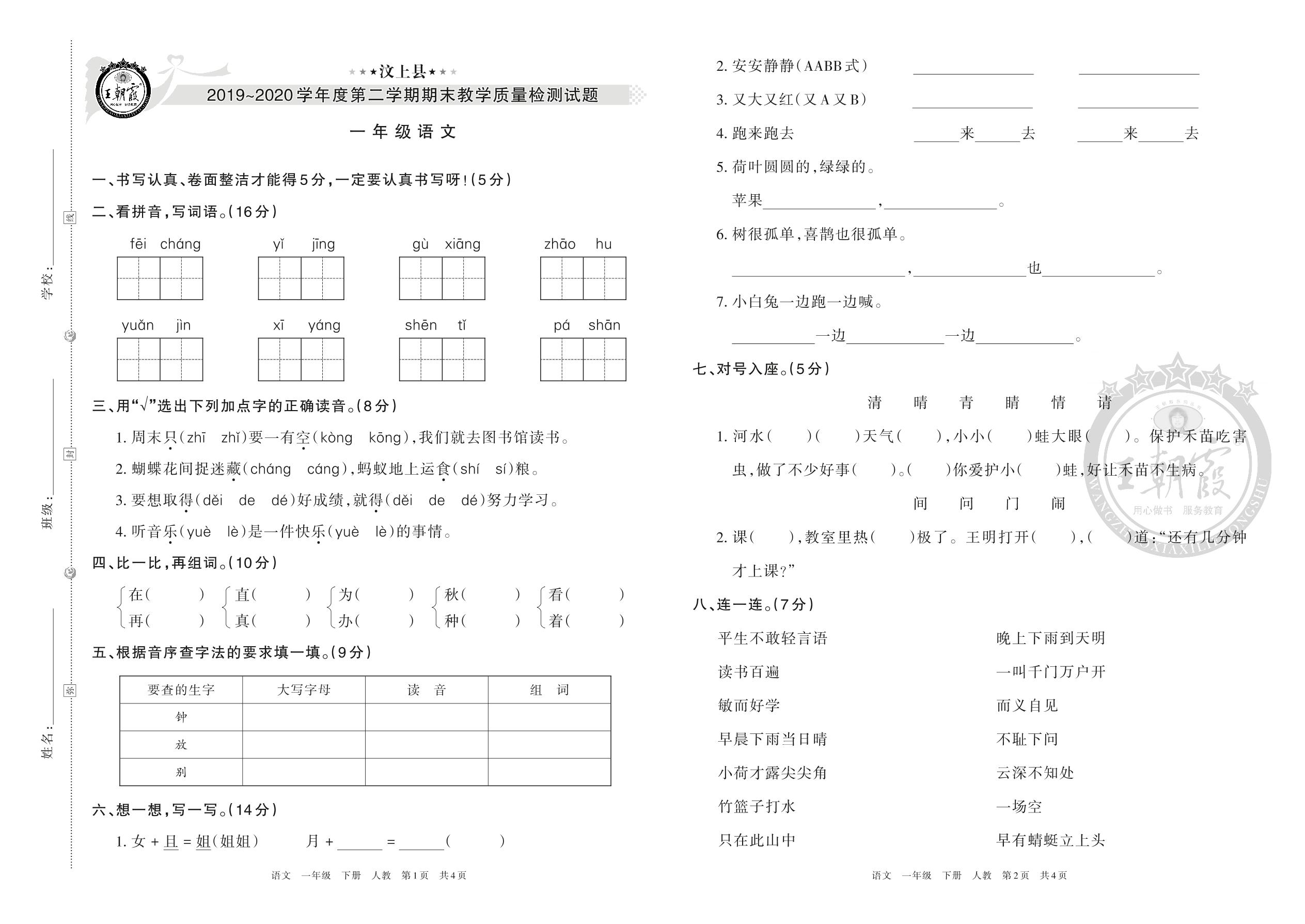 汶上县2019~2020学年度第二学期期末教学质量检测试题一年级语文(人教版)