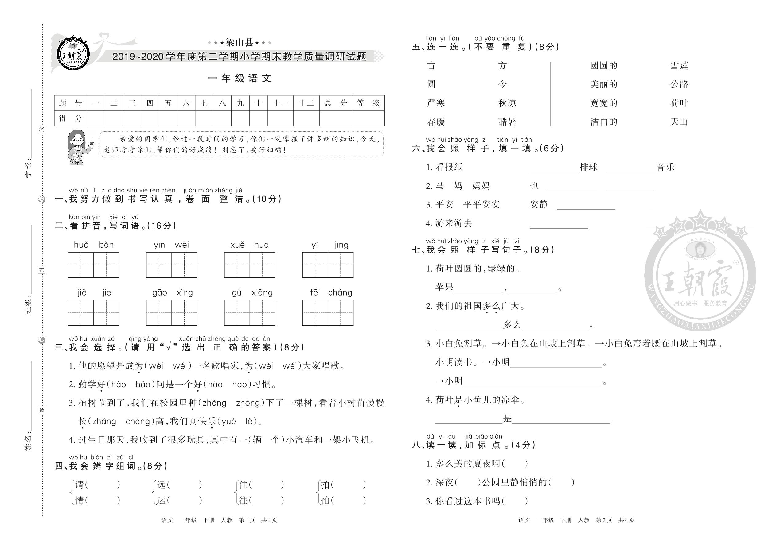 梁山县2019~2020学年度第二学期小学期末教学质量调研试题一年级语文(人教版)