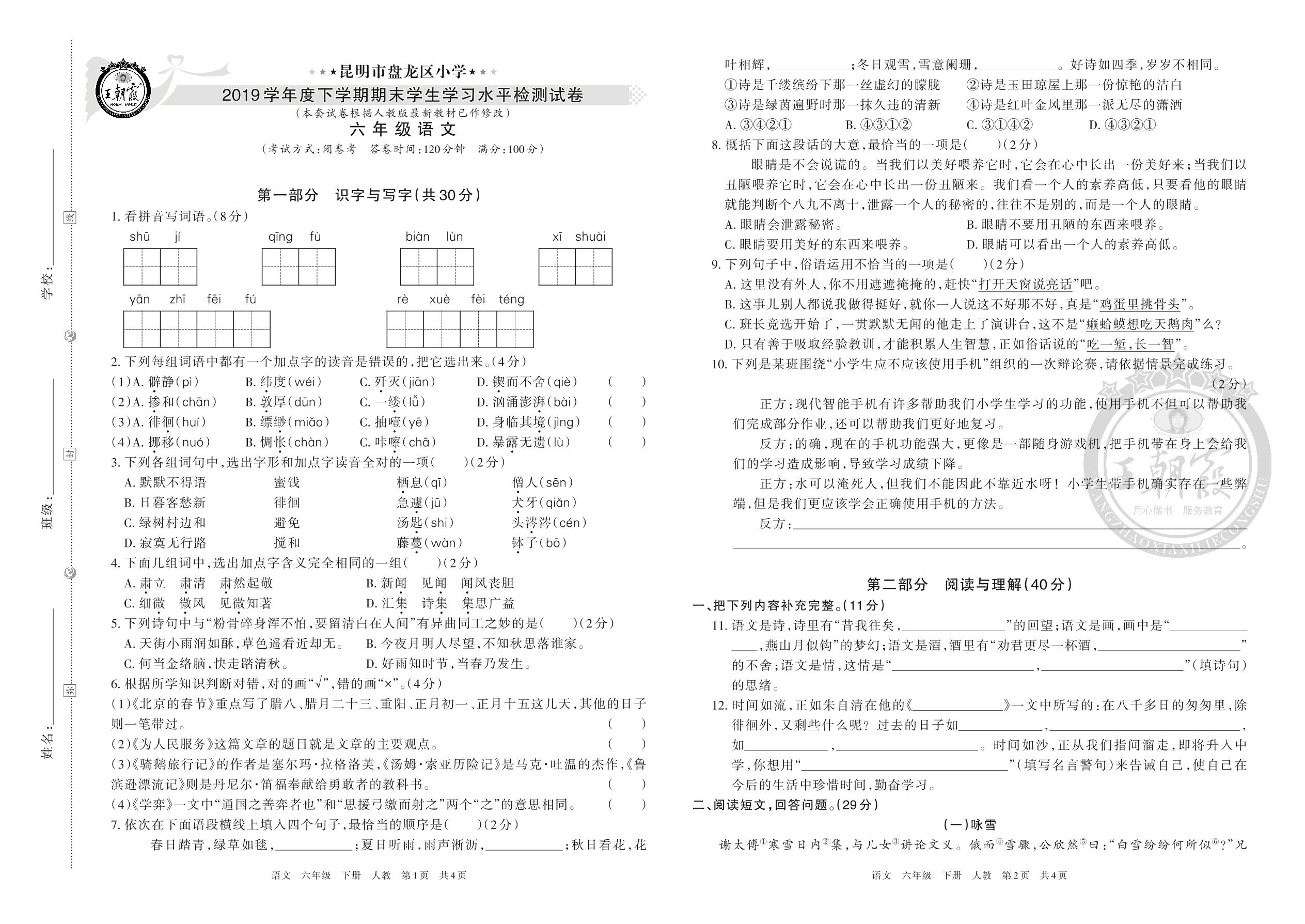 昆明市盘龙区小学2019学年度下学期期末学生学习水平检测试卷六年级语文(人教版)
