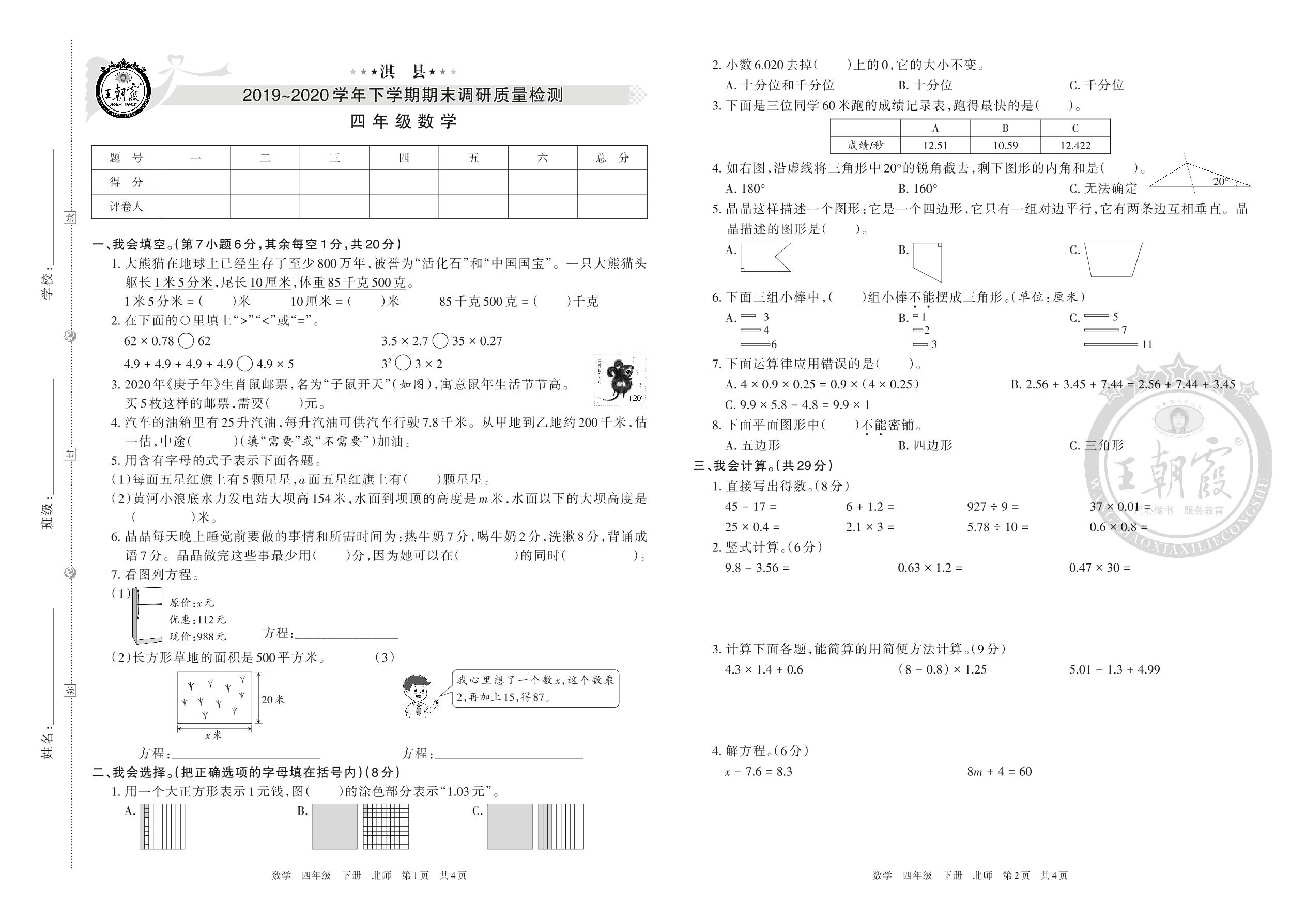 淇县2019~2020学年下学期期末调研质量检测四年级数学(北师版)