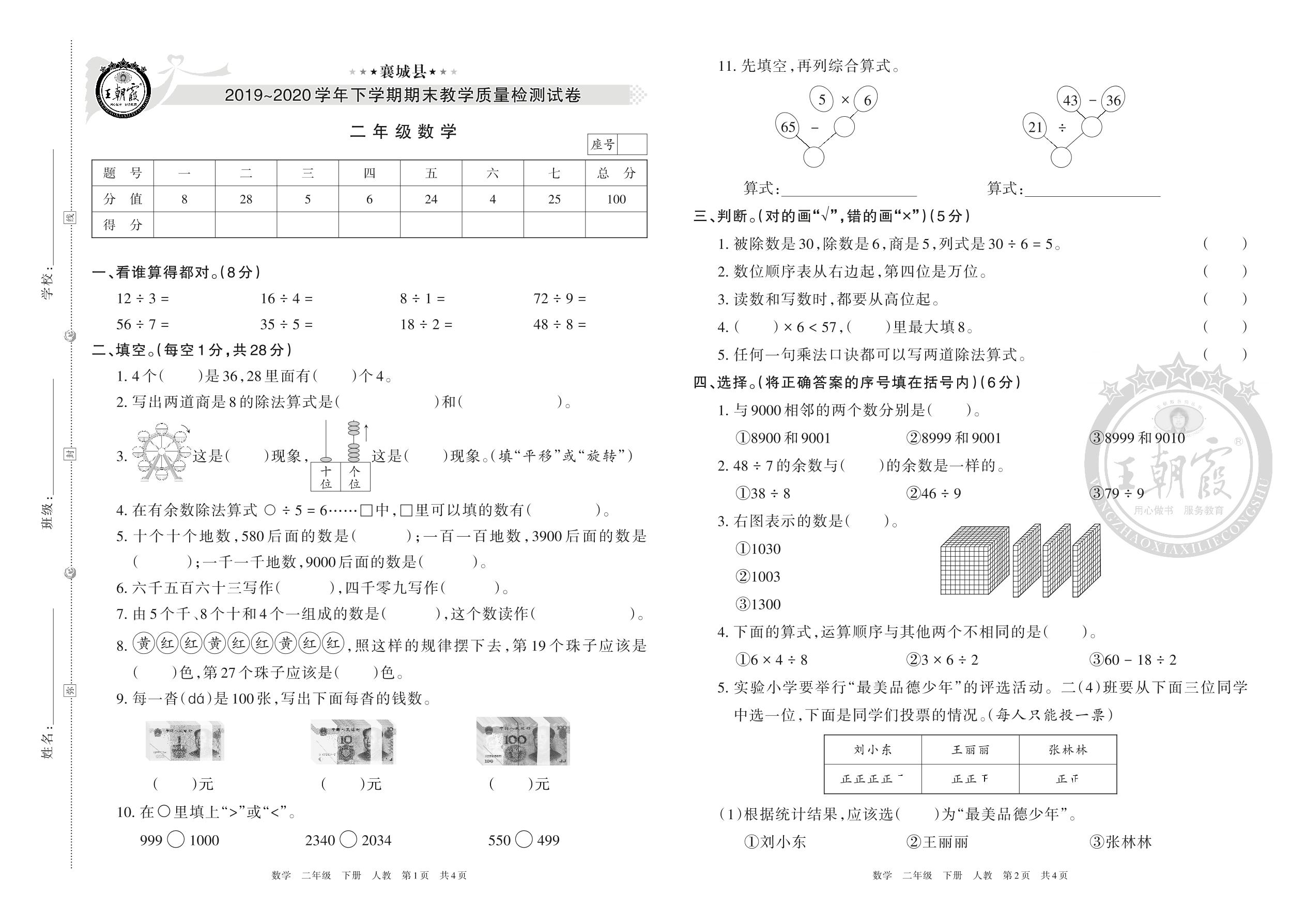 襄城县2019-2020学年下学期期末教学质量检测试卷二年级数学(人教版)