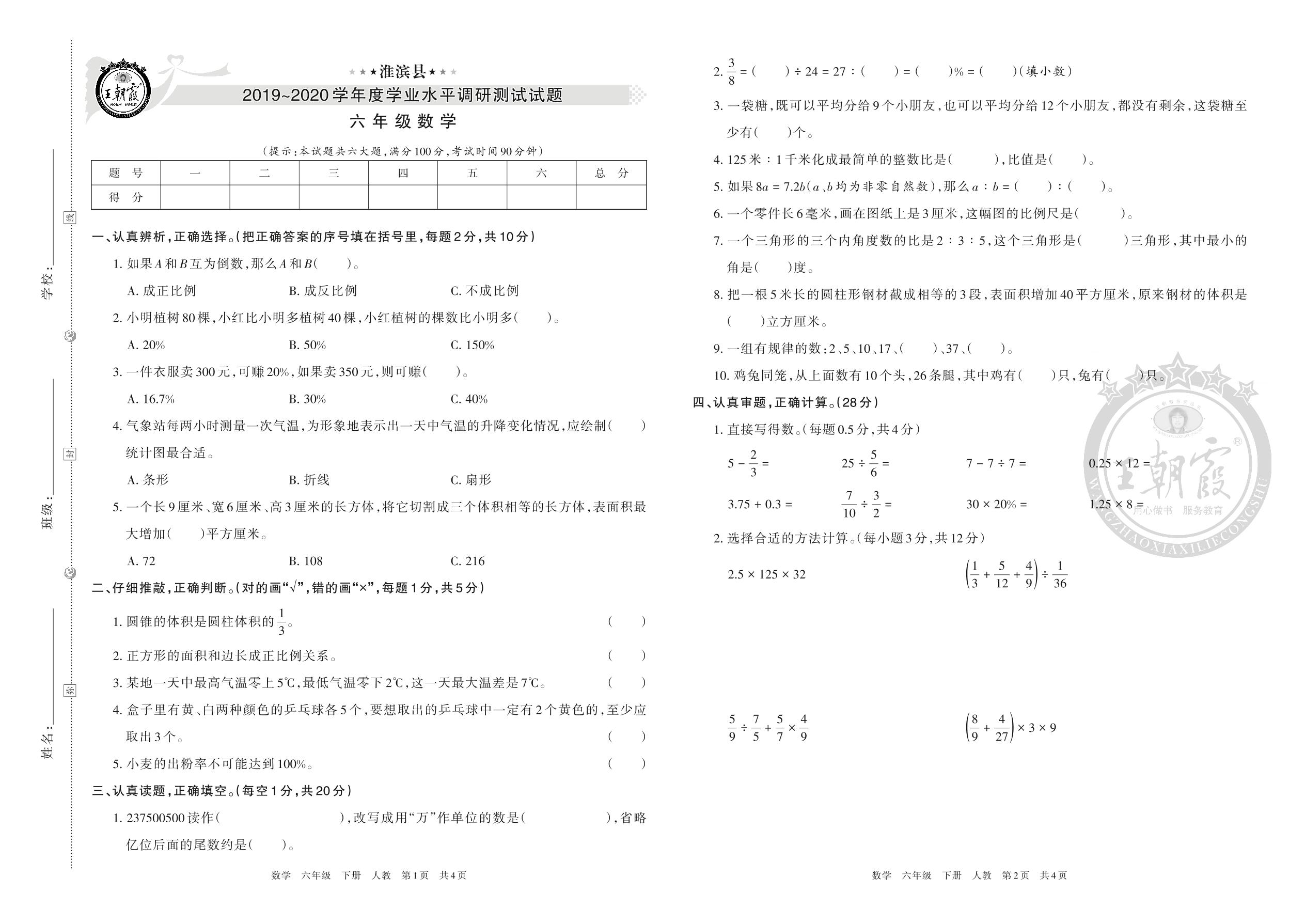 淮滨县2019~2020学年度学业水平点烟测试试题六年级数学(人教版)