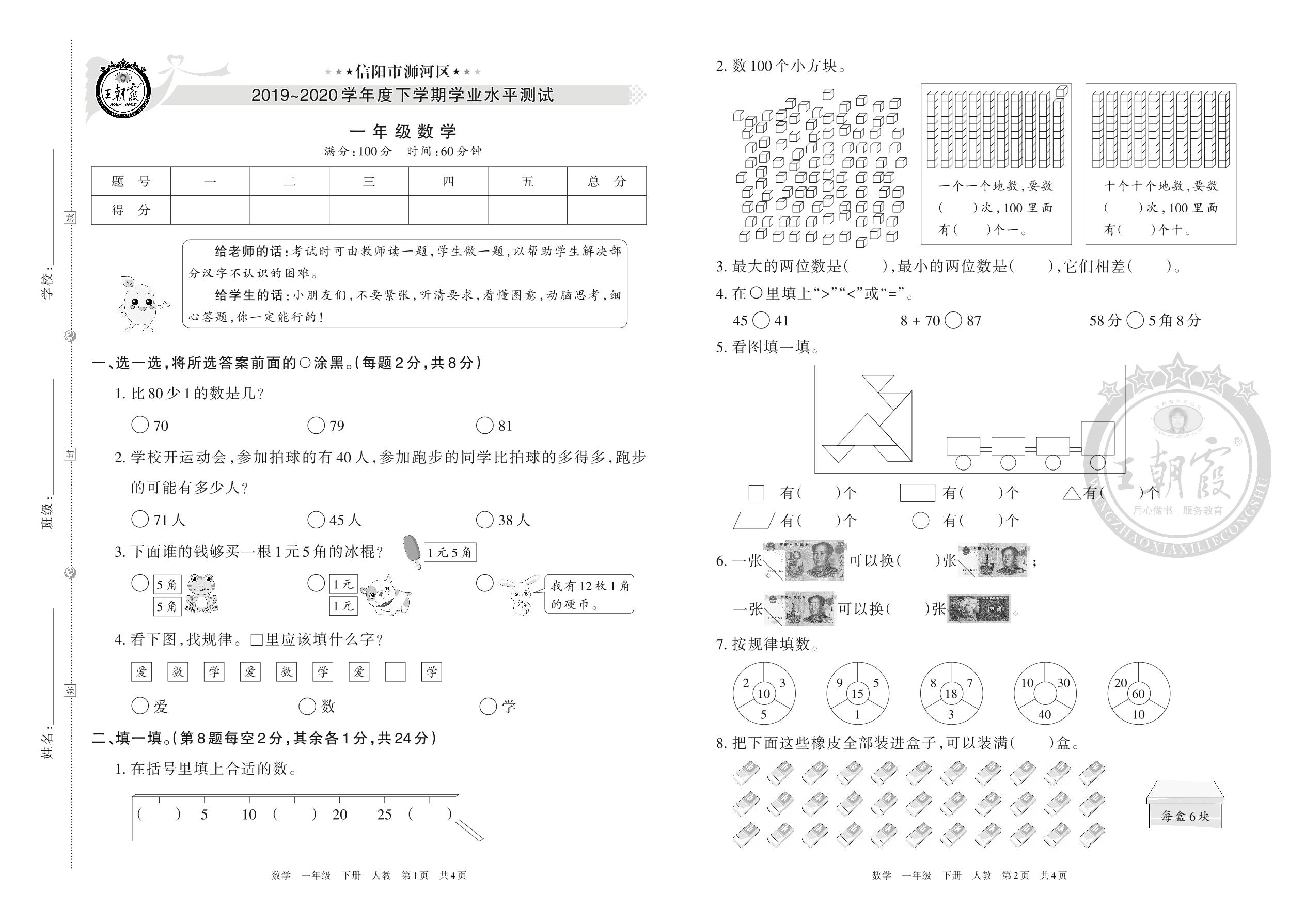 信阳市浉河区2019~2020学年度下学期学业水平测试一年级数学(人教版)