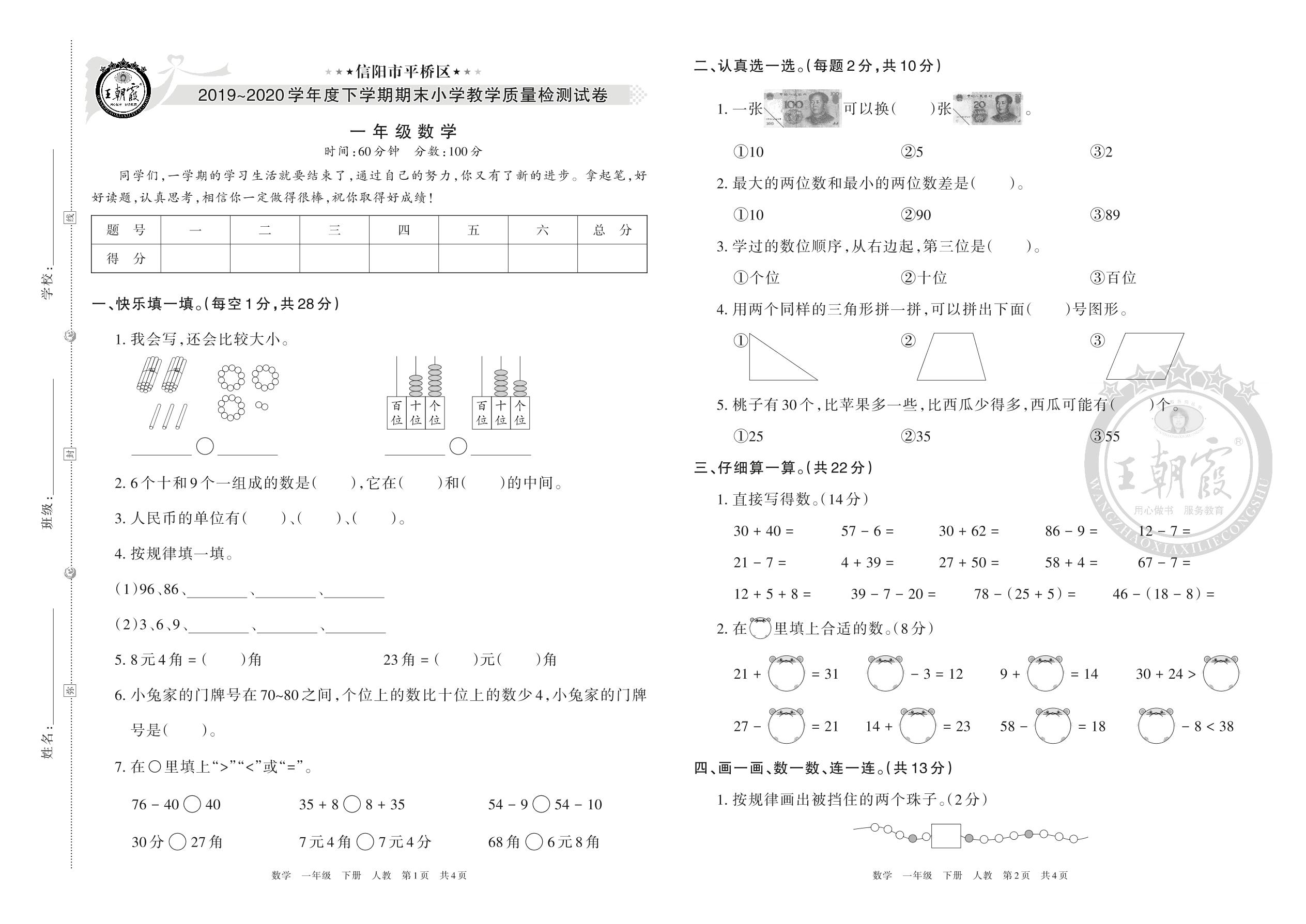 信阳市平桥区2019~2020学年度下学期期末小学教学质量检测试卷一年级数学(人教版)
