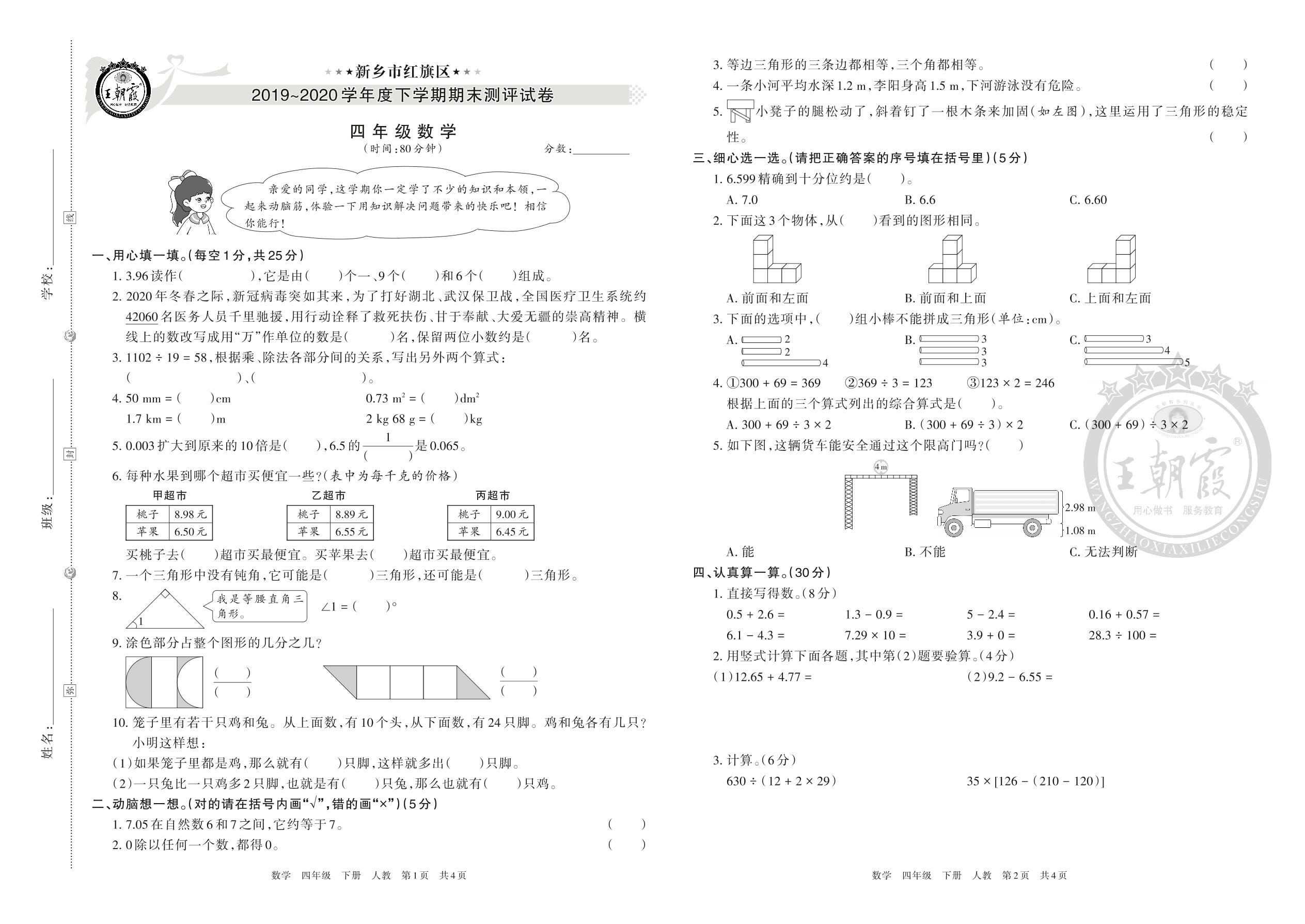 新乡市红旗区2019~2020学年度下期期末测评试卷四年级数学(人教版)