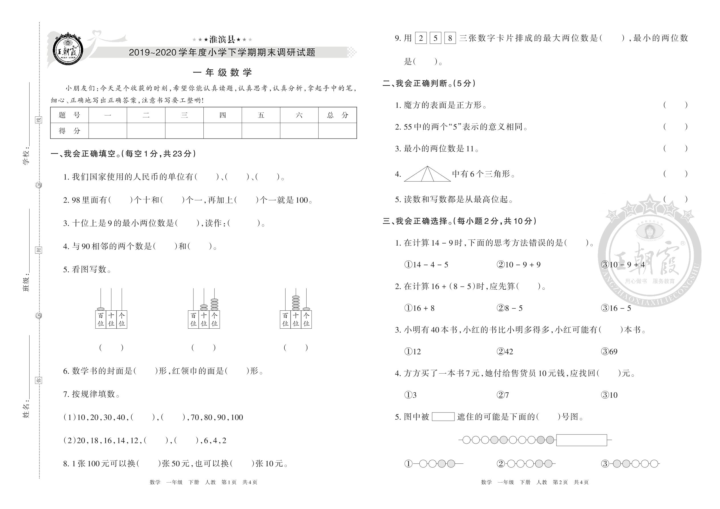 一年级数学人教版下册期末卷