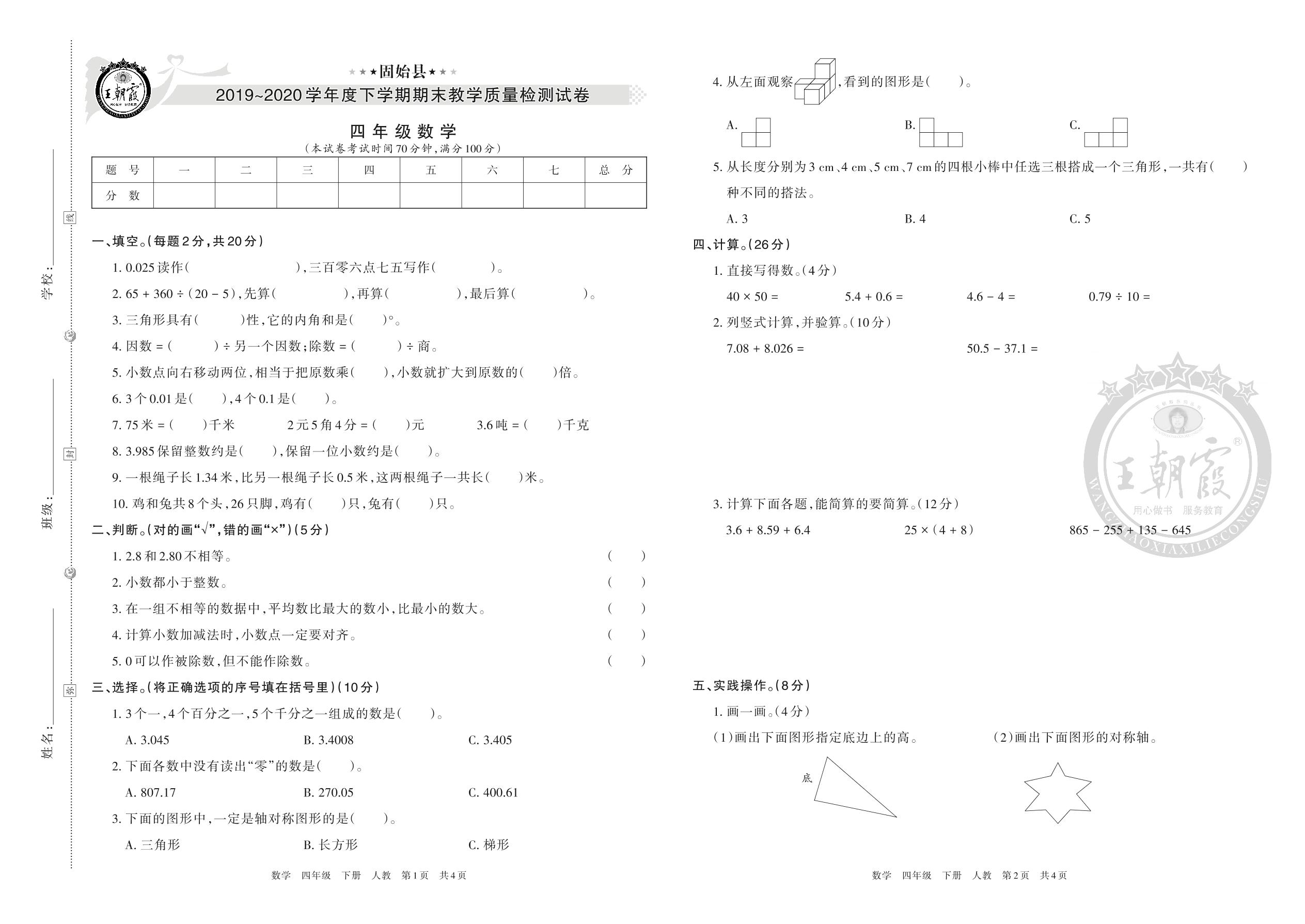 固始县2019~2020学年度下期期末教学质量监测试卷四年级数学(人教版)