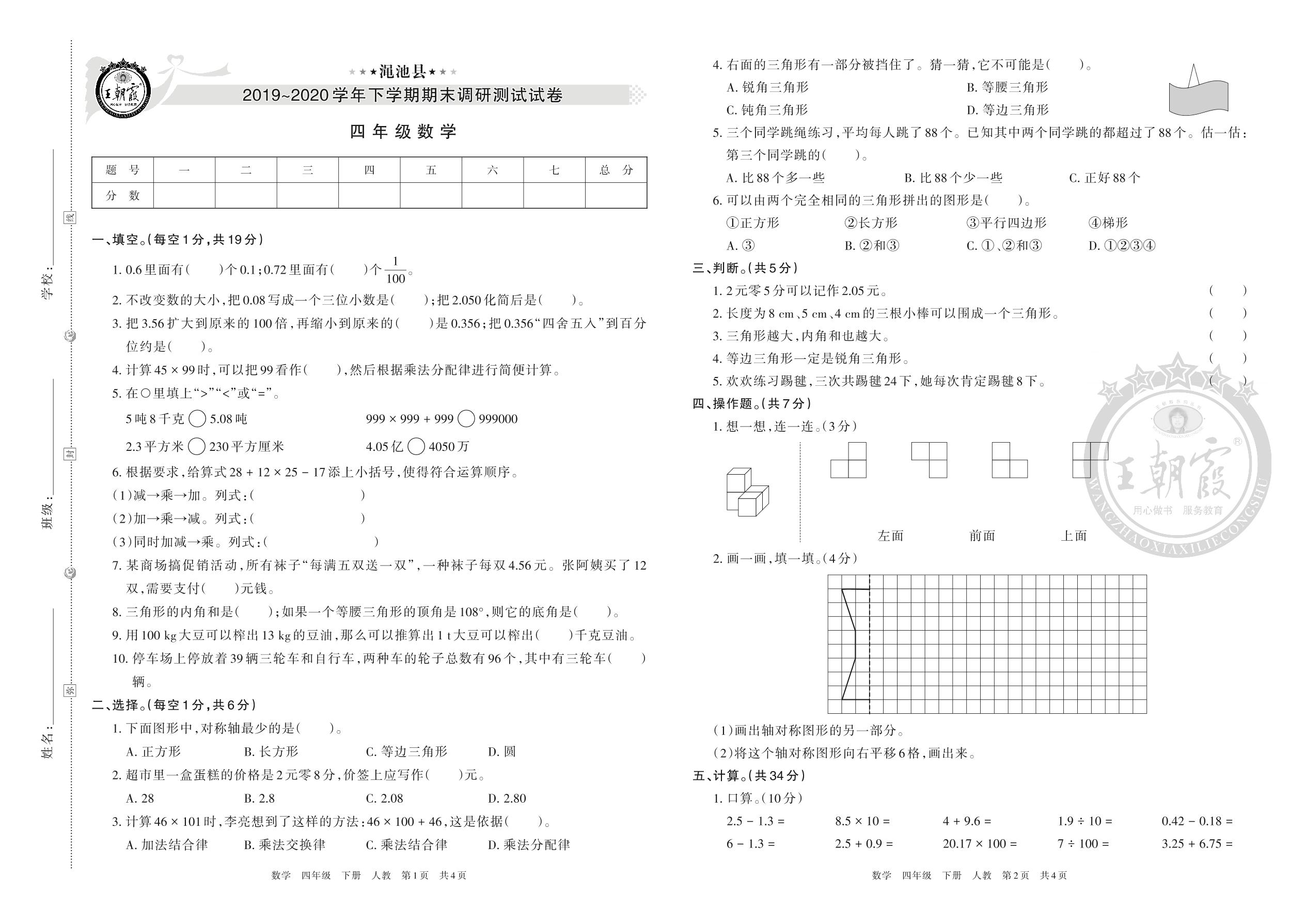 渑池县2019~2020学年下学期期末调研测试试卷四年级数学(人教版)