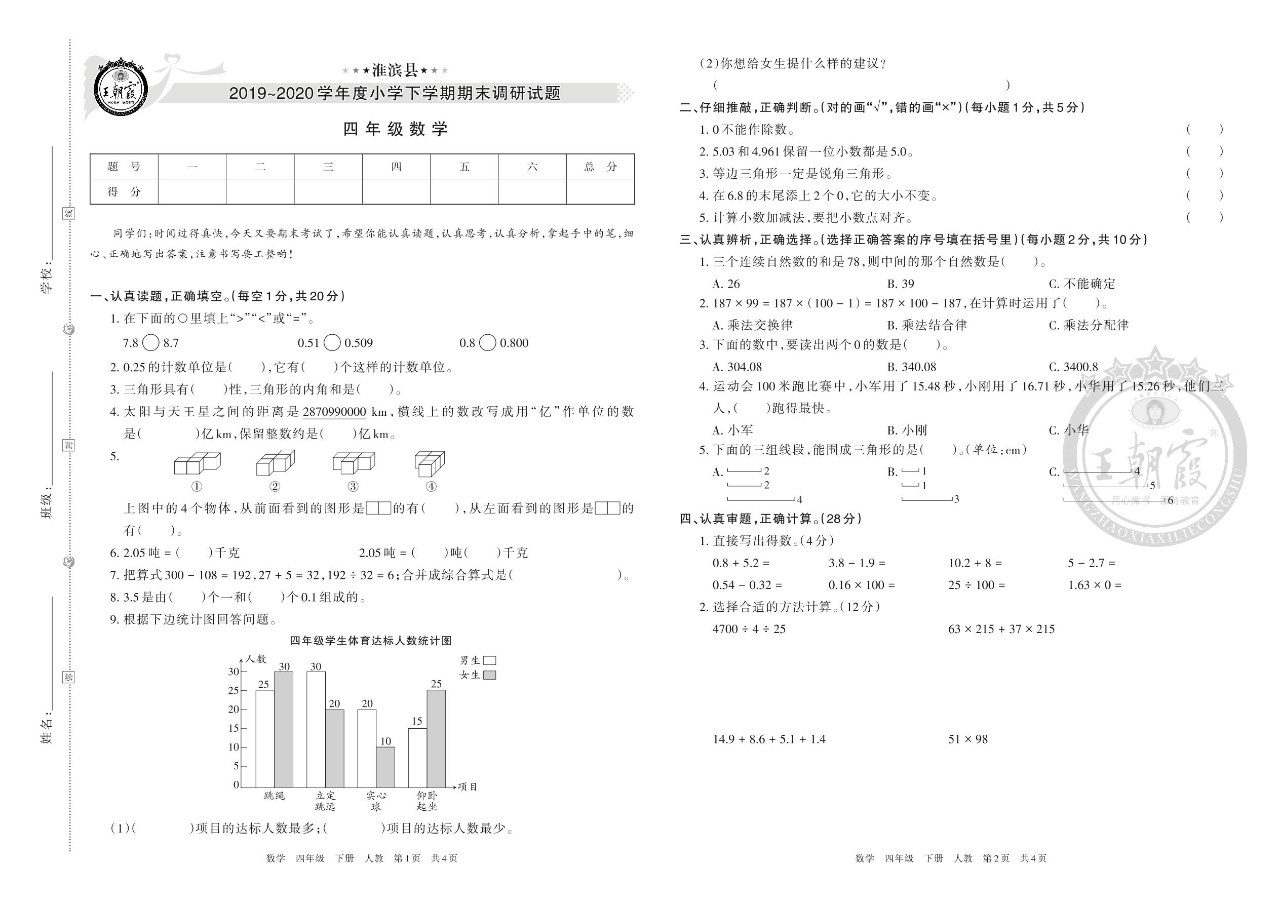 淮滨县2019~2020学年度小学下期期末数学调研试题四年级数学(人教版)