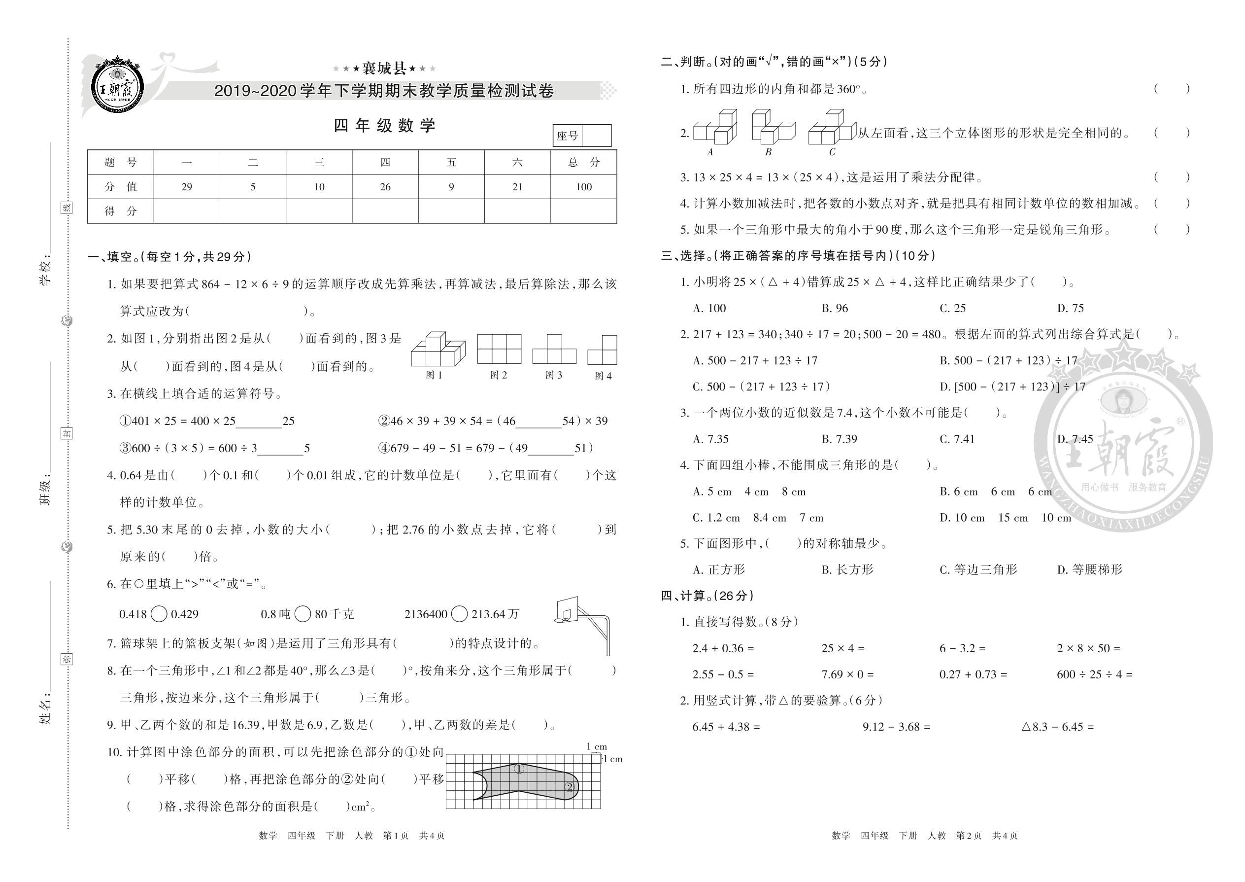 襄城县2019~2020学年下学期期末教学质量检测试卷四年级数学(人教版)