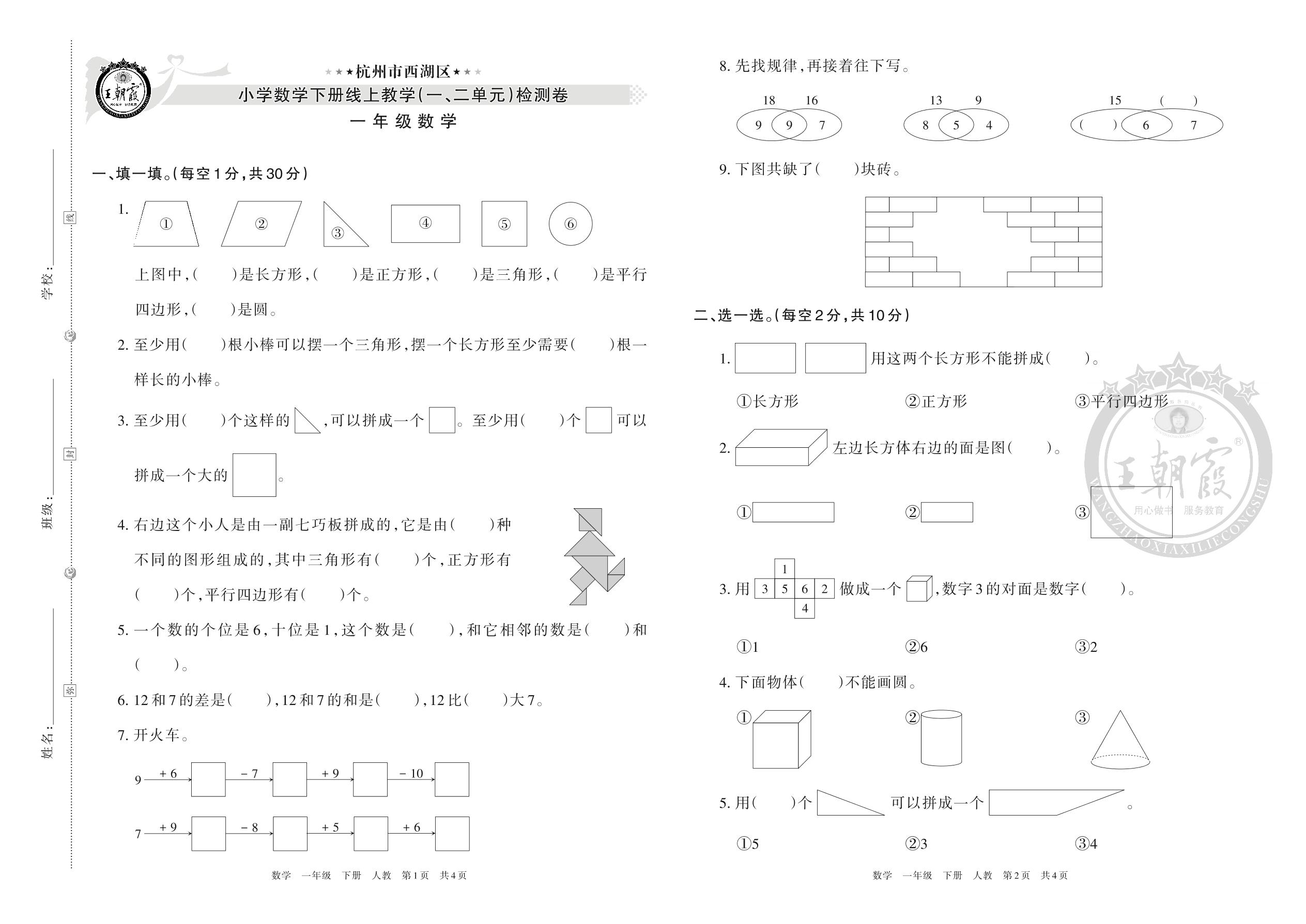 杭州市西湖区小学数学下册线上教学(一、二单元)检测卷一年级数学(人教版)