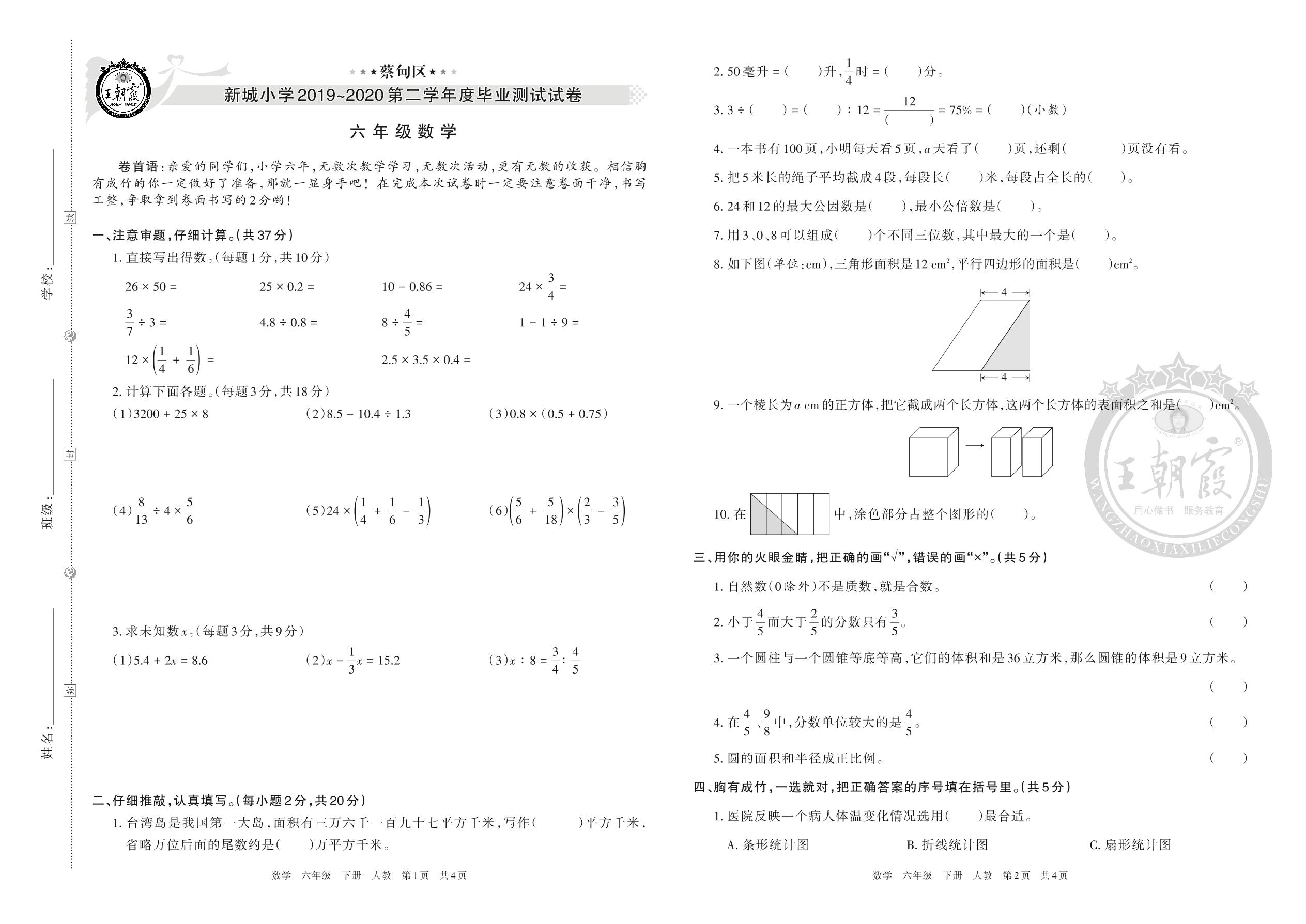 蔡甸区新城小学2019~2020第二学年度毕业测试试卷六年级数学(人教版)