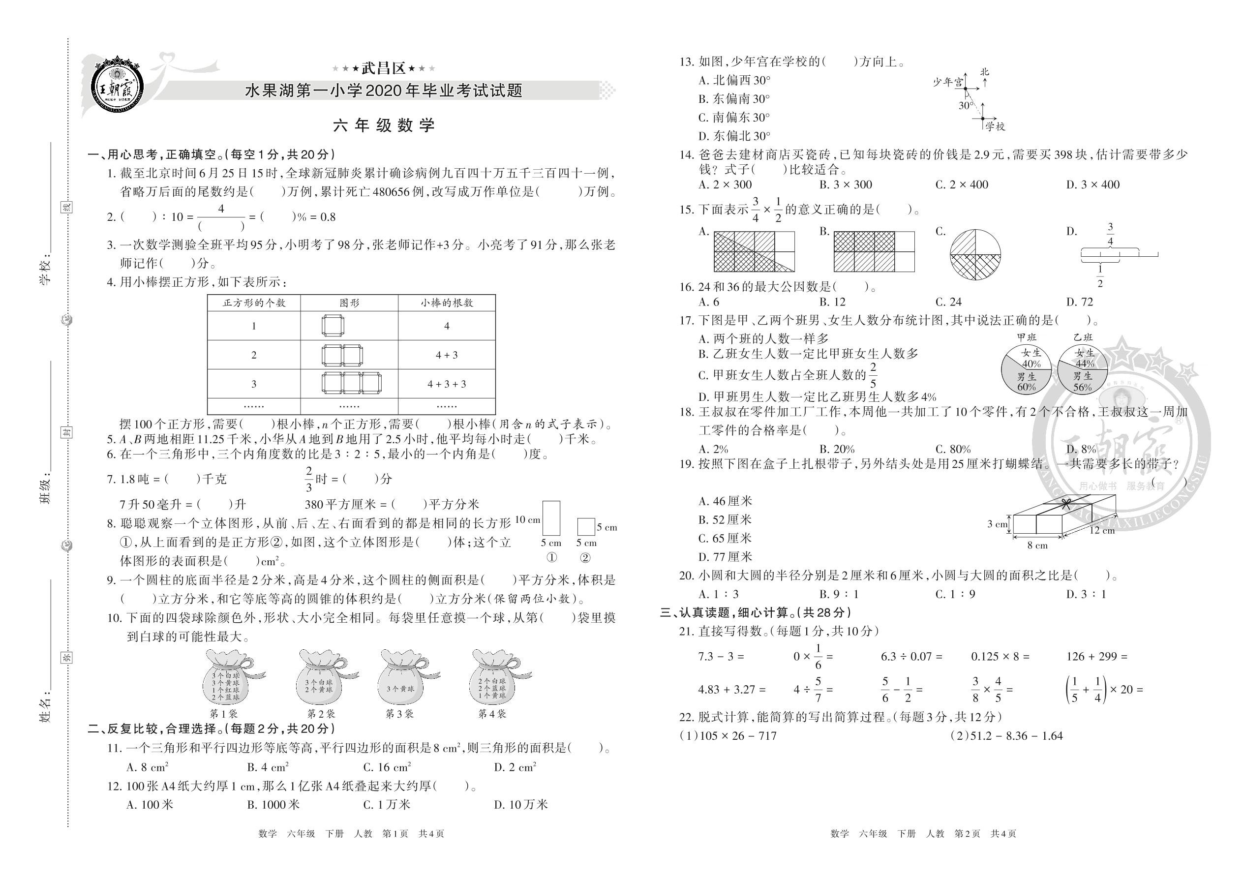 武昌区水果湖第一小学2020年毕业考试试题六年级数学(人教版)