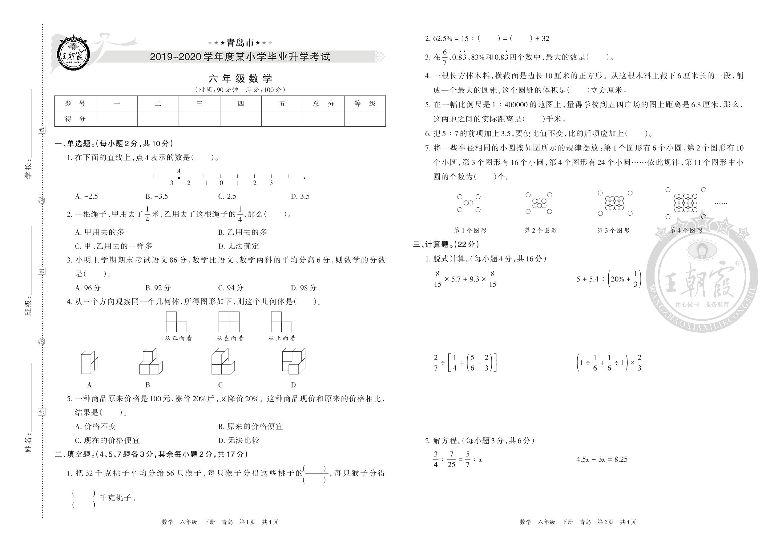 青岛市2019~2020学年度某小学毕业升学考试六年级数学(人教版)