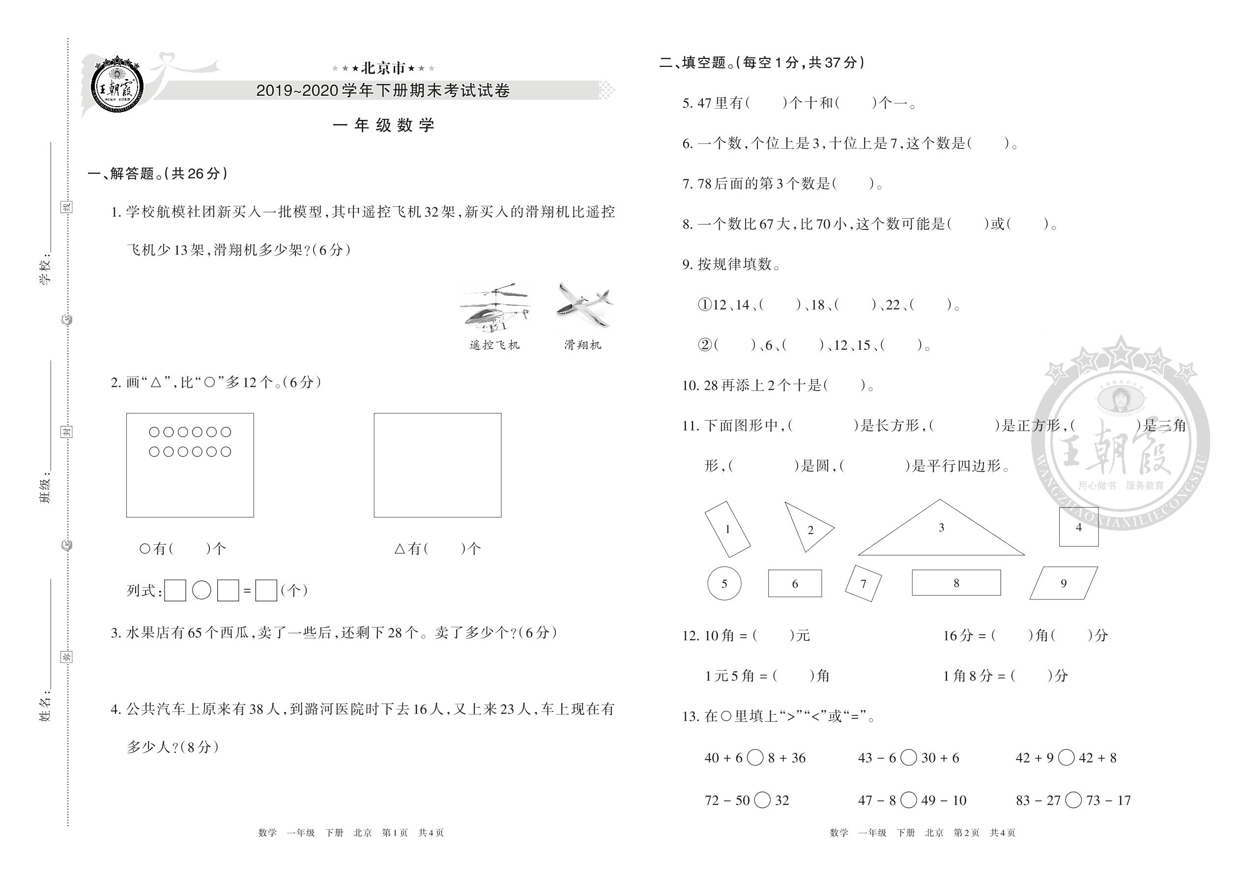 北京市2019~2020学年下册期末考试试卷一年级数学(北京版)