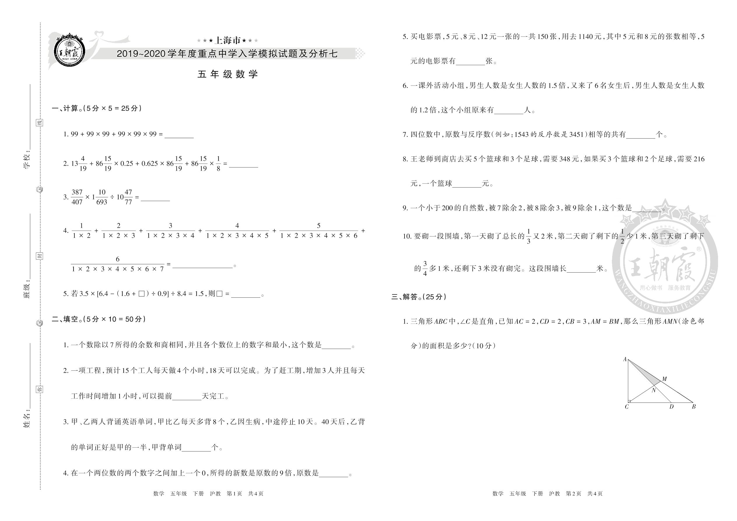 上海市2019~2020学年度重点中学入学模拟试题及分析七五年级数学(沪教版)
