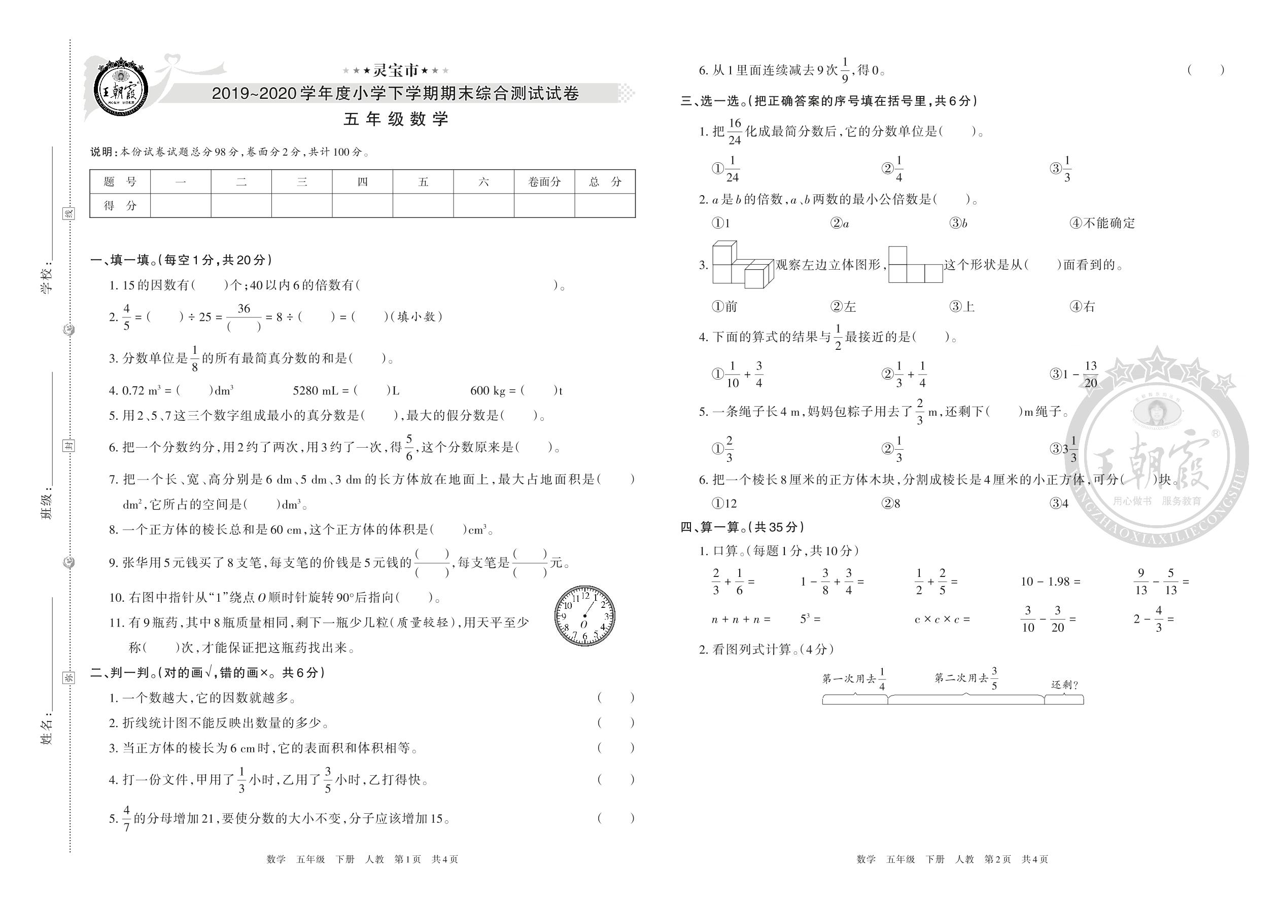 灵宝市2019~2020学年度小学下学期期末综合测试试卷五年级数学(人教版)