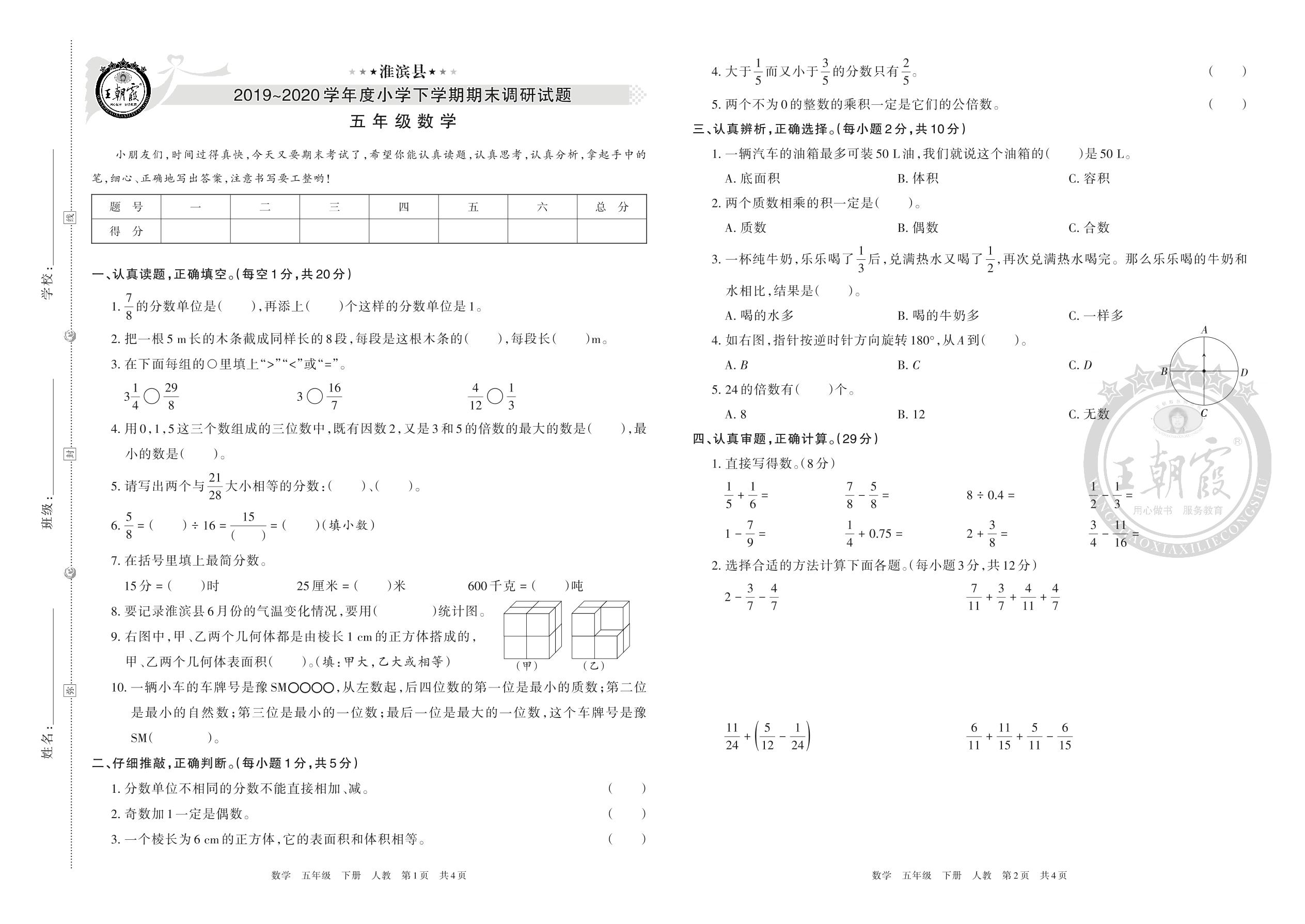 淮滨县2019~2020学年度小学下学期期末调研试题五年级数学(人教版)