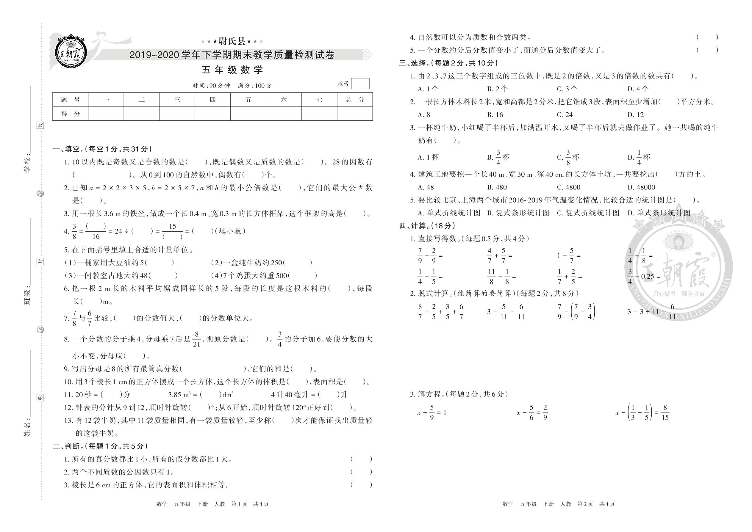 尉氏县2019~2020学年下学期期末教学质量检测试卷五年级数学(人教版)