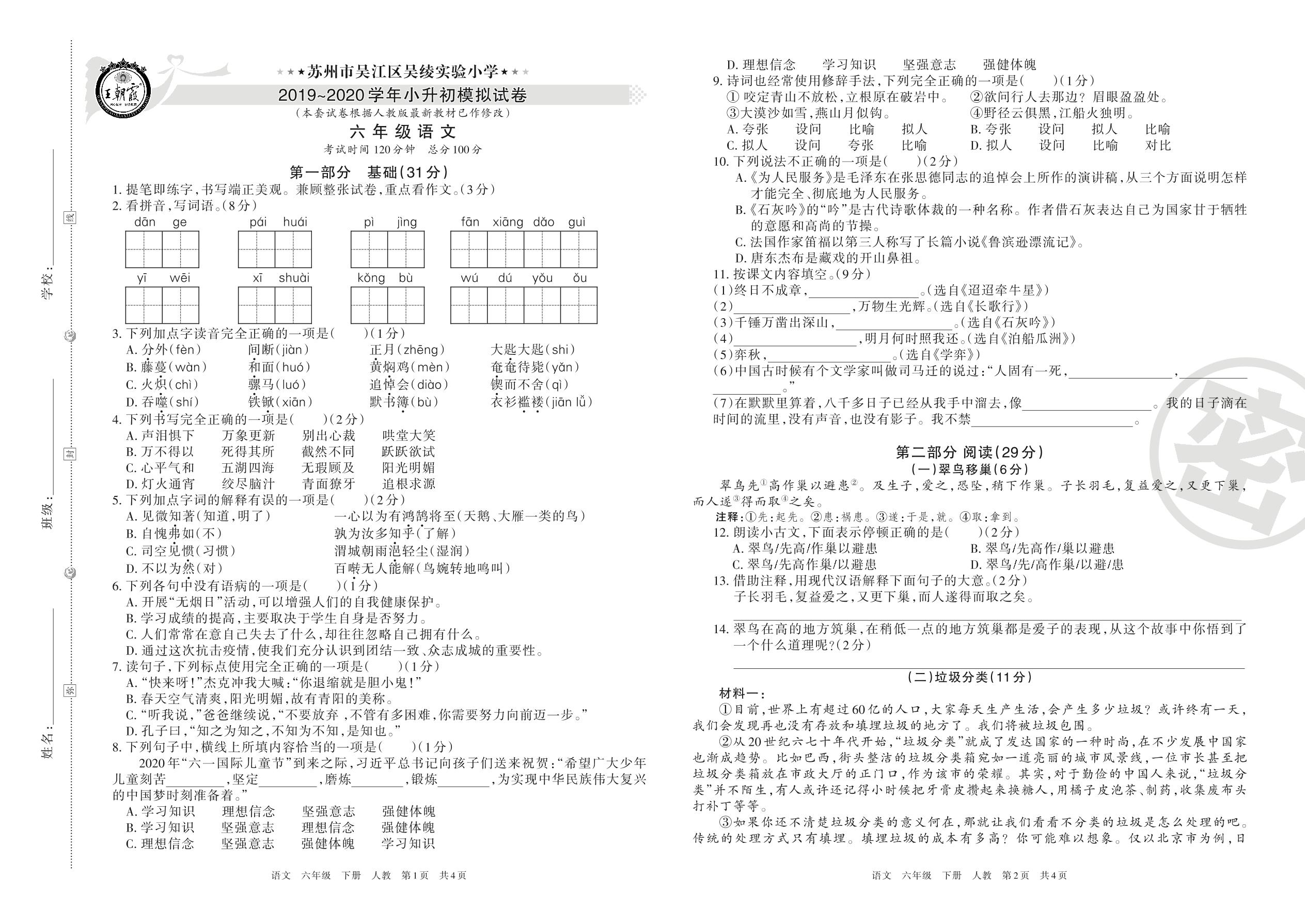 苏州市吴江区吴绫实验小学2019~2020学年小升初模拟试卷六年级语文(人教版)