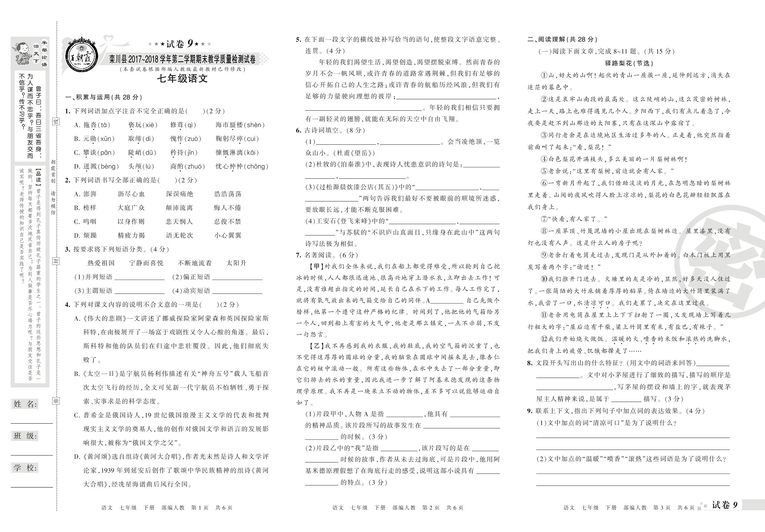 2017-2018学年第二学期洛阳市栾川县七年级语文试卷(人教版)【9】
