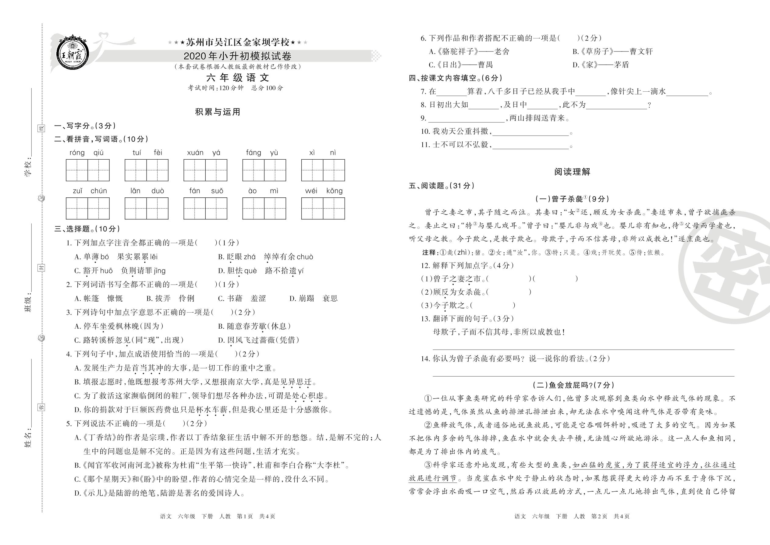 苏州市吴江区金家坝学校2020年小升初模拟试卷六年级语文(人教版)