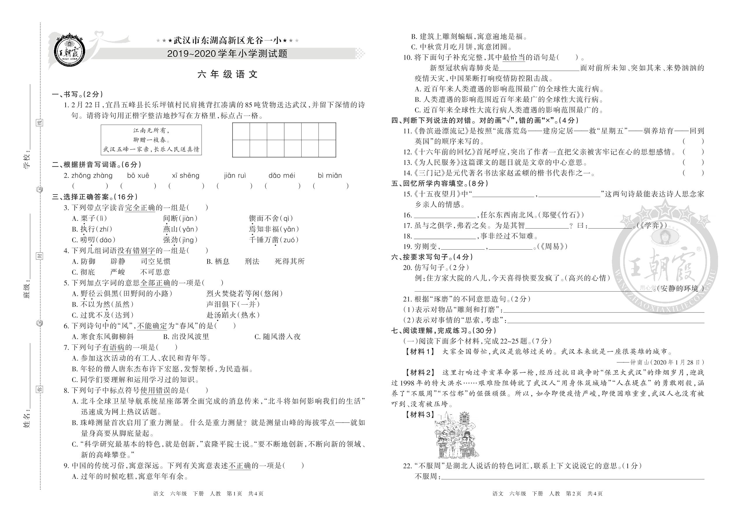 武汉市东湖高新区光谷一小2019~2020学年小学测试题六年级语文(人教版)