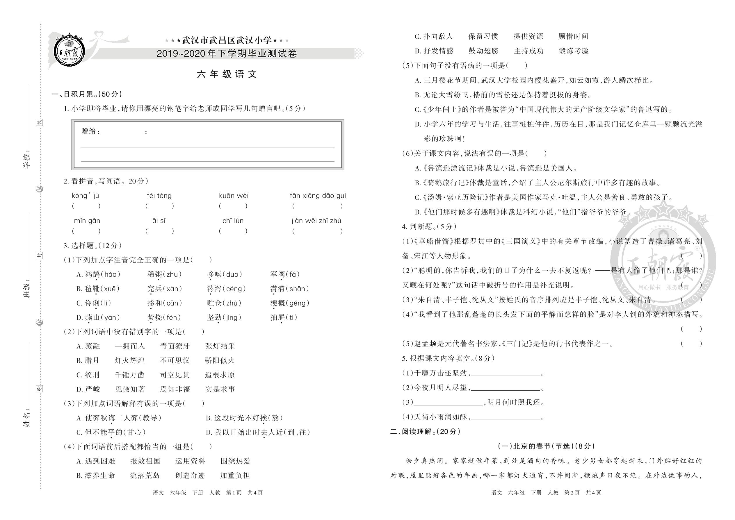 武汉市武昌区武汉小学2019~2020年下学期毕业测试卷六年级语文(人教版)