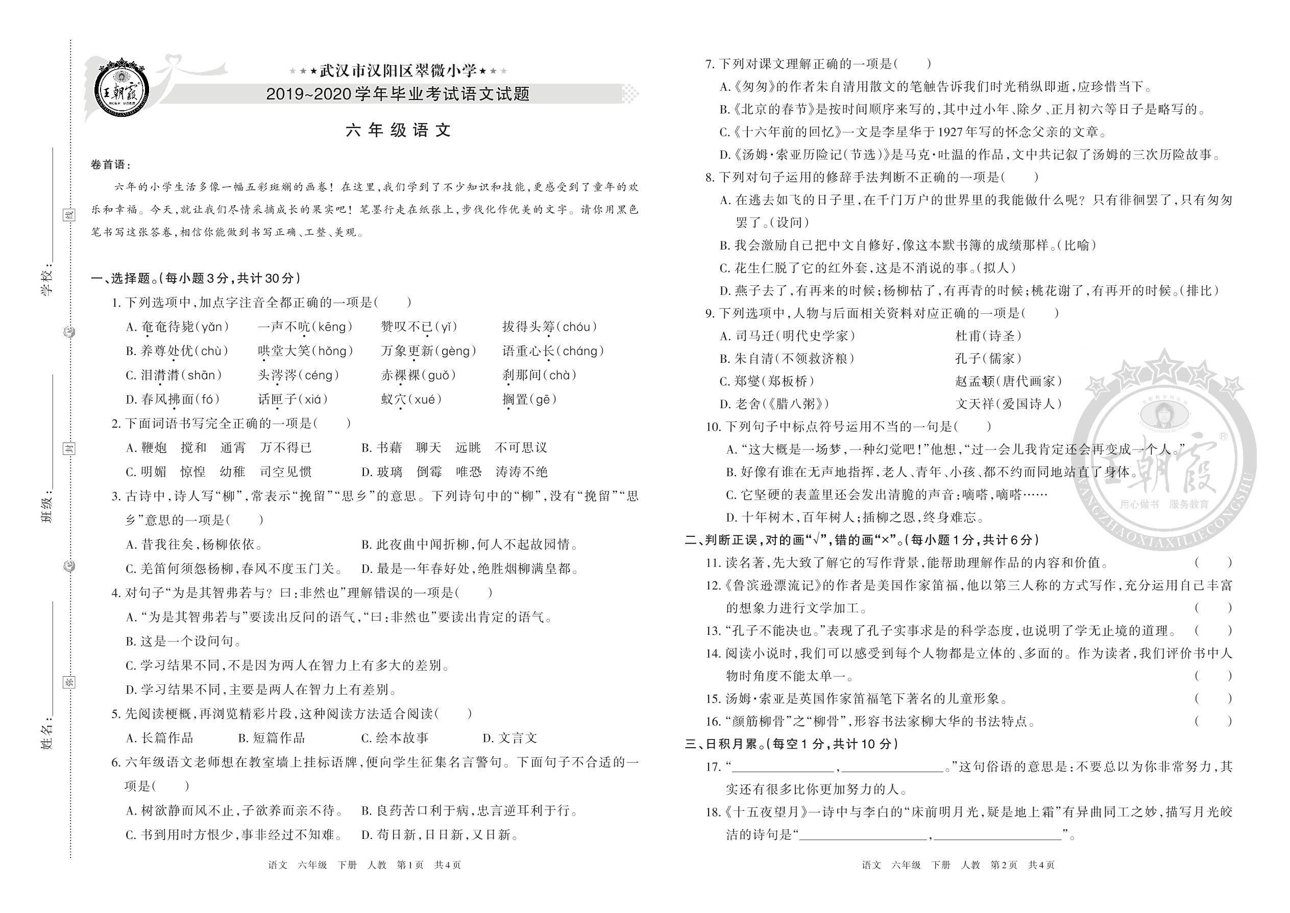武汉市汉阳区翠微小学2019~2020学年毕业考试语文试题六年级语文(人教版)