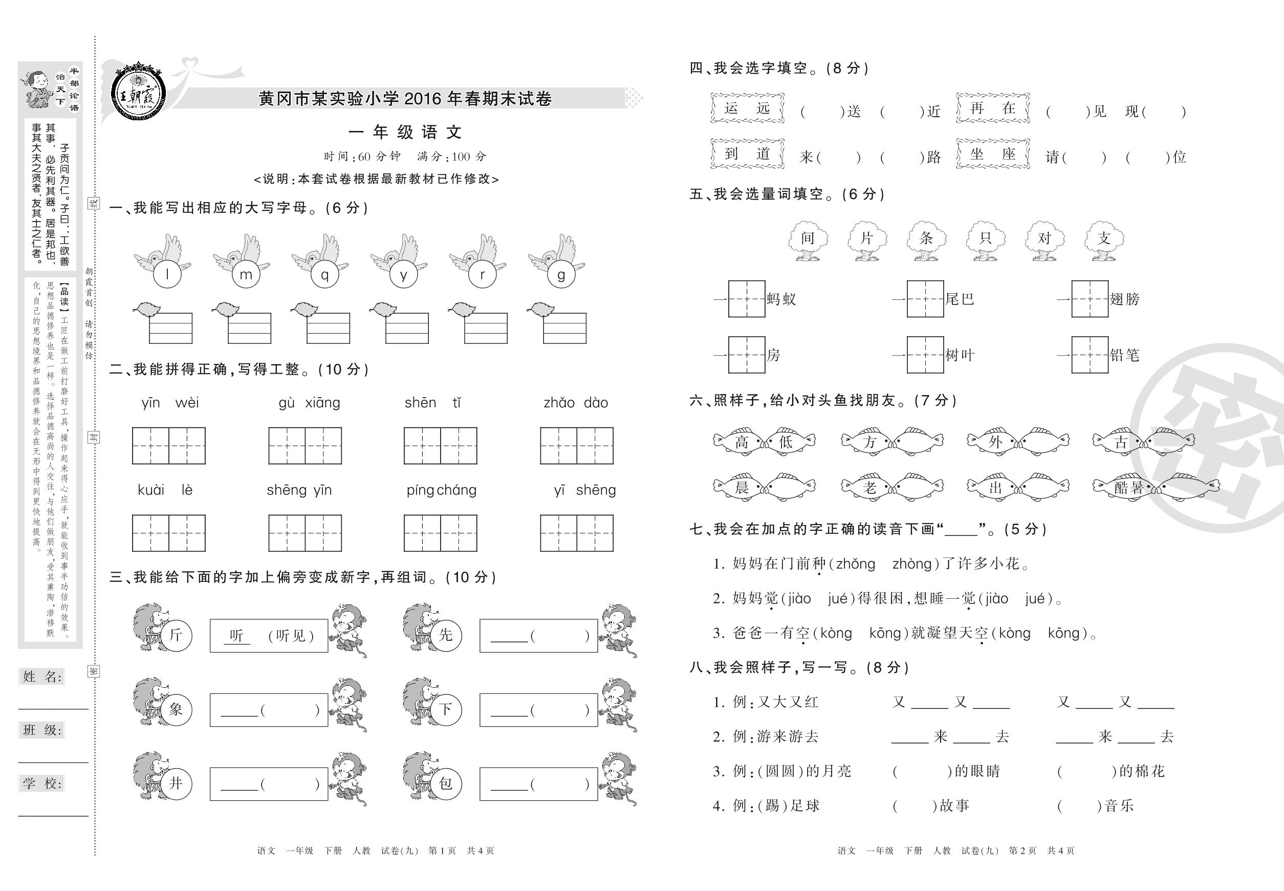2015-2016学年第二学期黄冈市一年级语文试卷(人教版)【9】