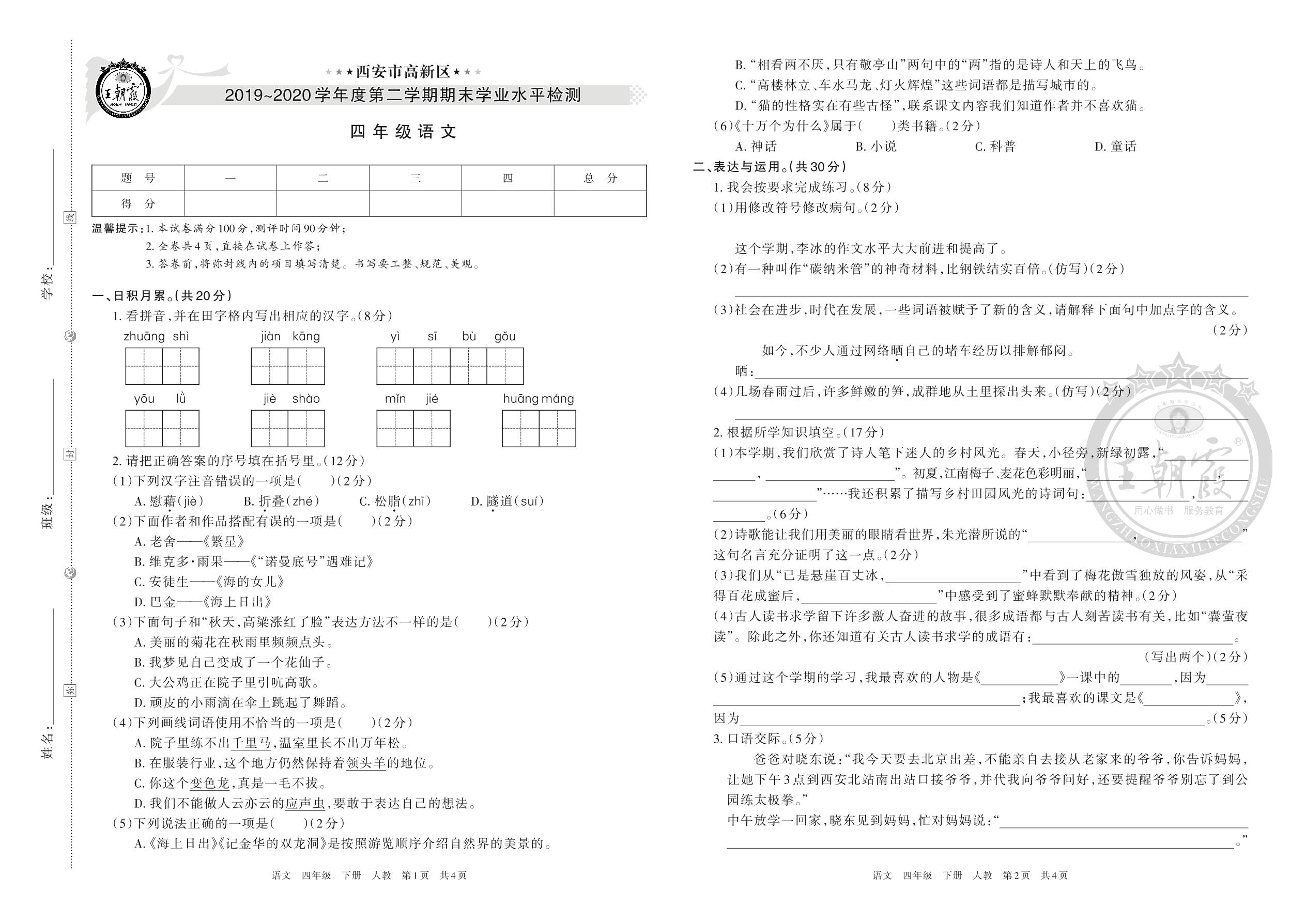 西安市高新区2019~2020学年度第二学期期末学业水平检测四年级语文(人教版)