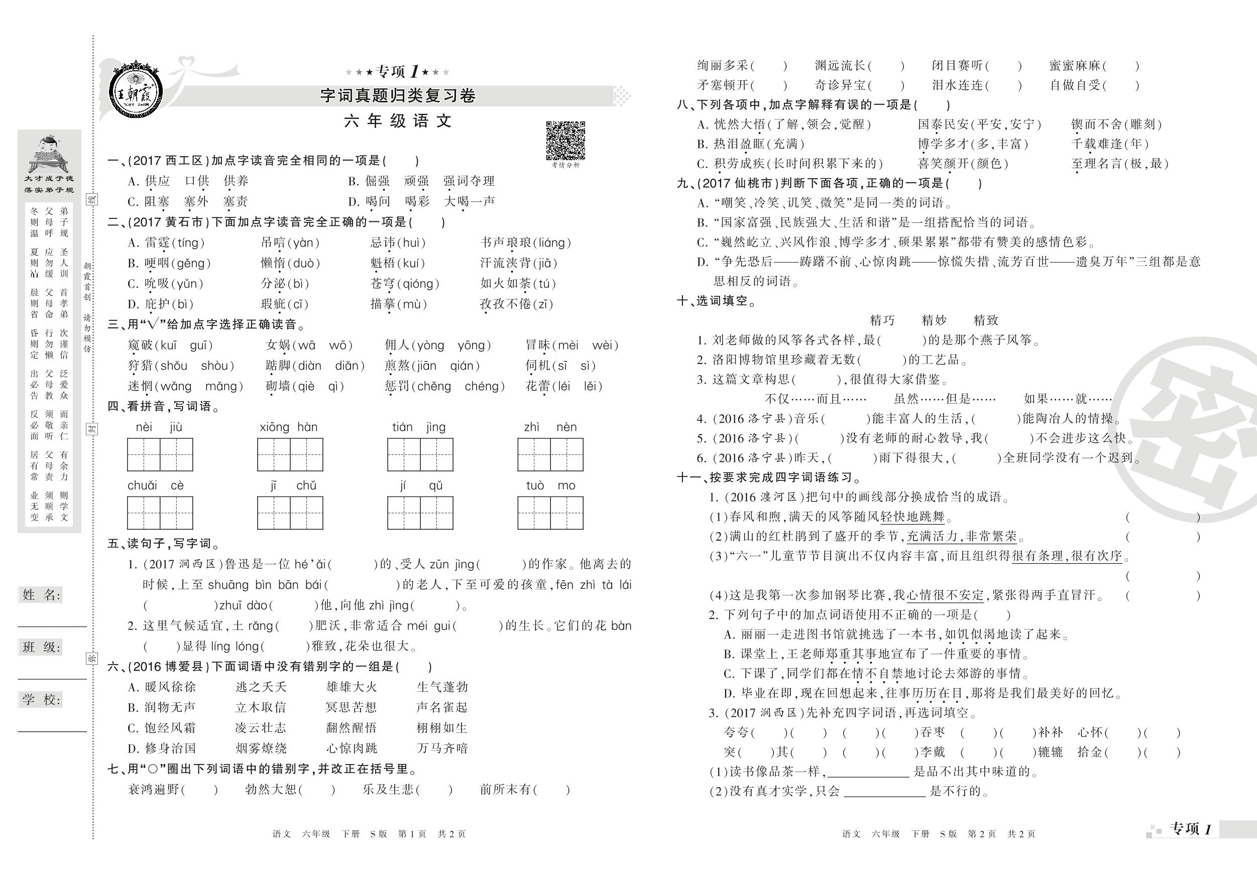 王朝霞期末专项卷——字词、句子真题归类复习卷六年级下册语文(S版)_R21080230238【0】