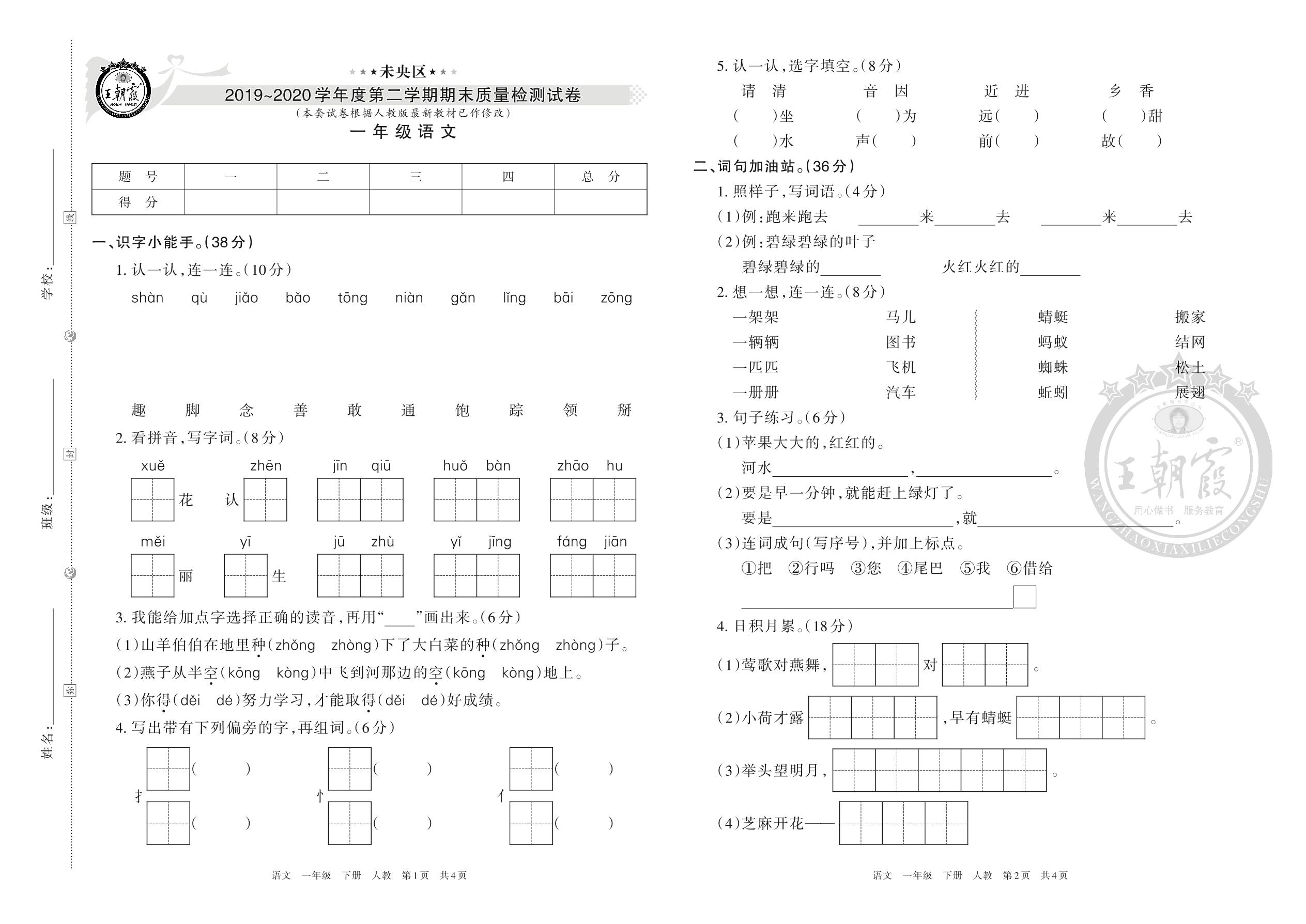 未央区2019~2020学年度第二学期期末质量检测试卷一年级语文(人教版)