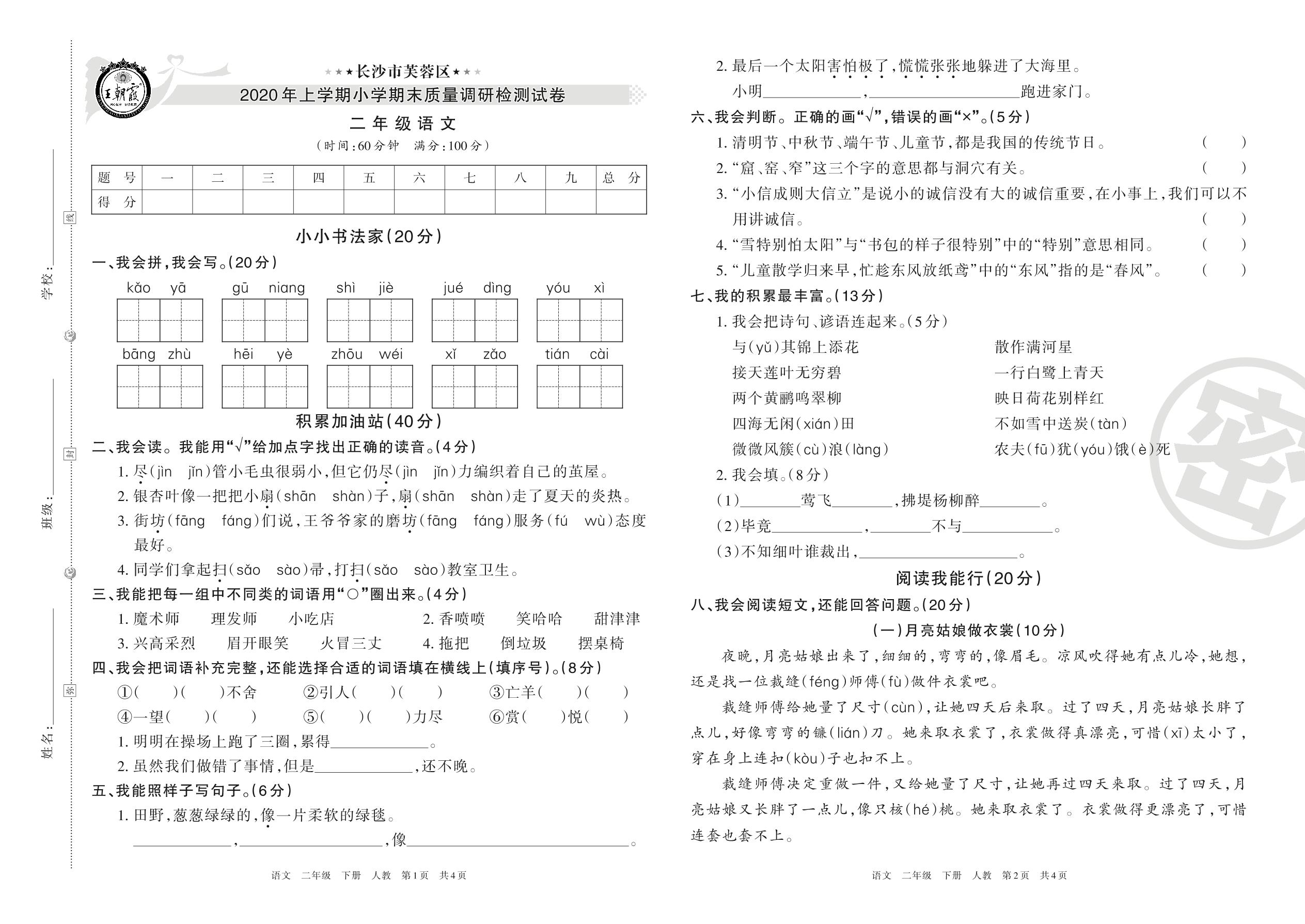 长沙市芙蓉区2020年上学期小学期未质量调研检测试卷二年级语文(人教版)