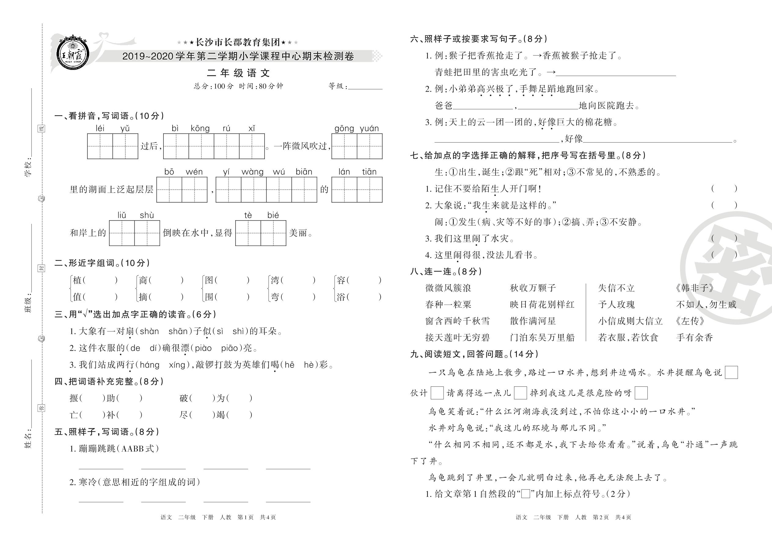 长沙市长郡教育集团2019~2020学年第二学期小学课程中心期末检测卷二年级语文(人教版)