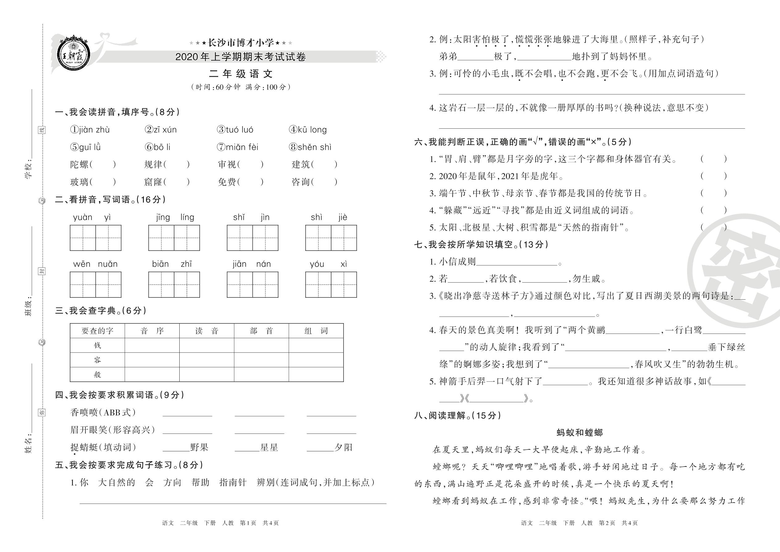 长沙市博才小学南2020年上学期期未考试试卷二年级语文(人教版)