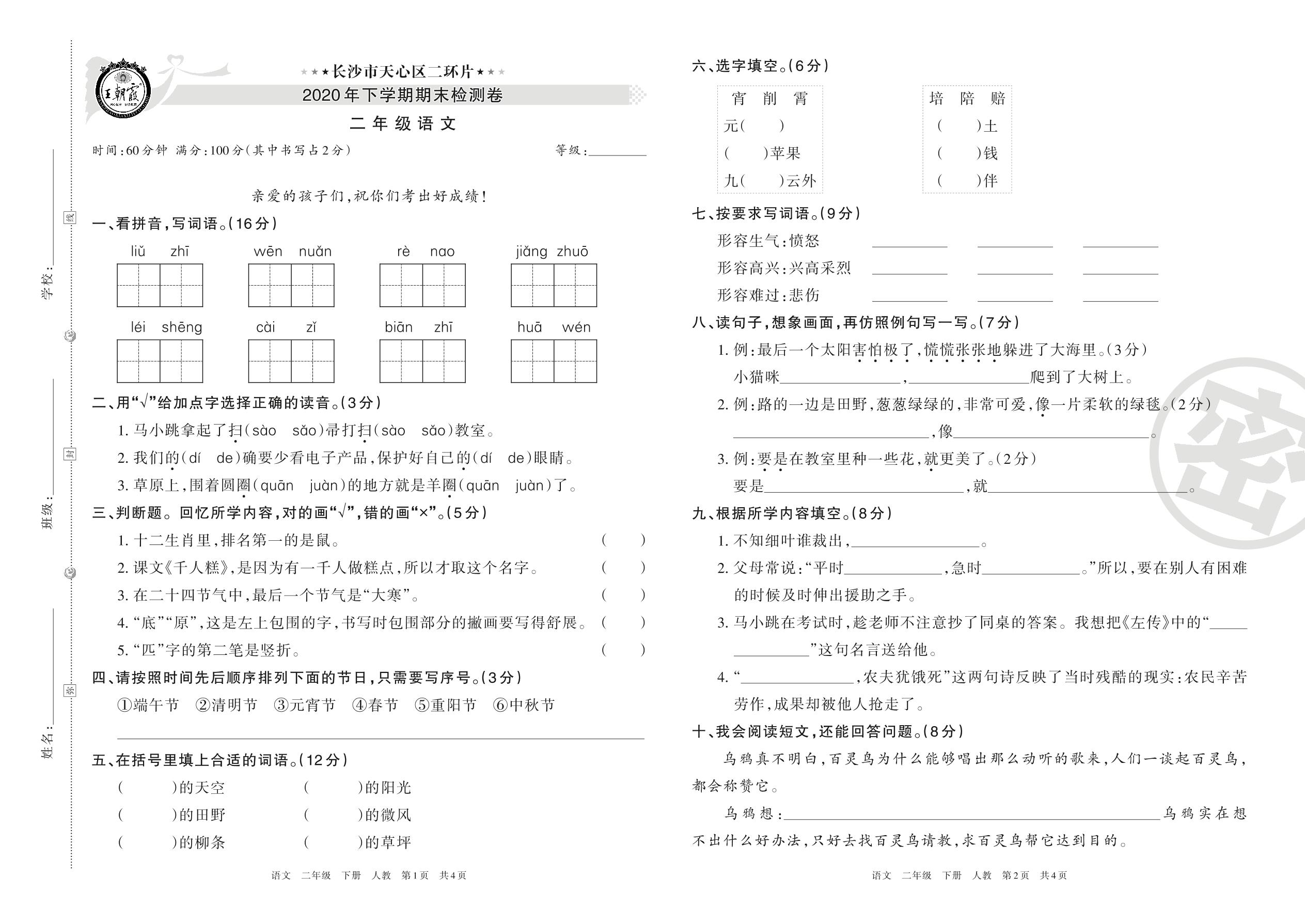 长沙市天心区二环片2020年下学期期末检测卷二年级语文(人教版)