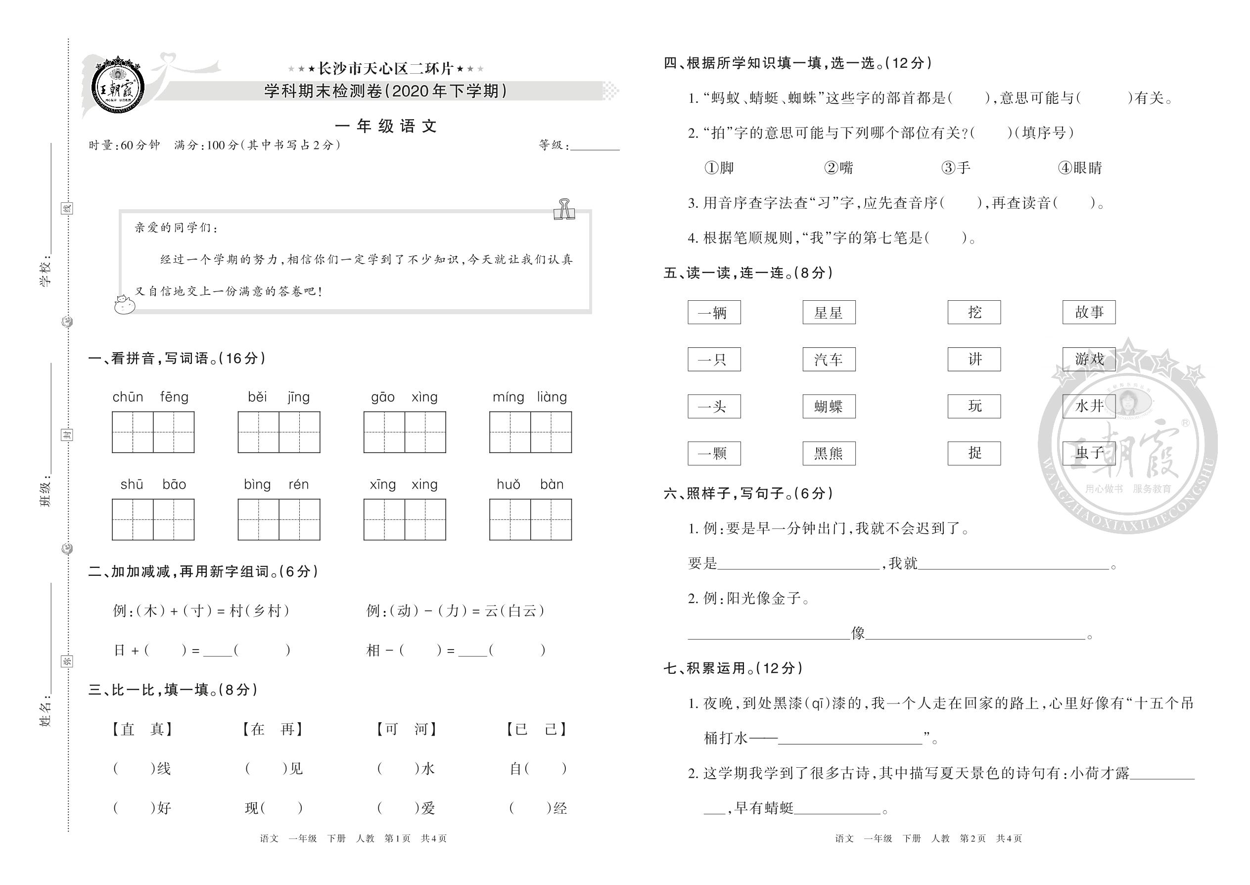 长沙市天心区二环片学科期末检测卷(2020年下学期)一年级语文(人教版)