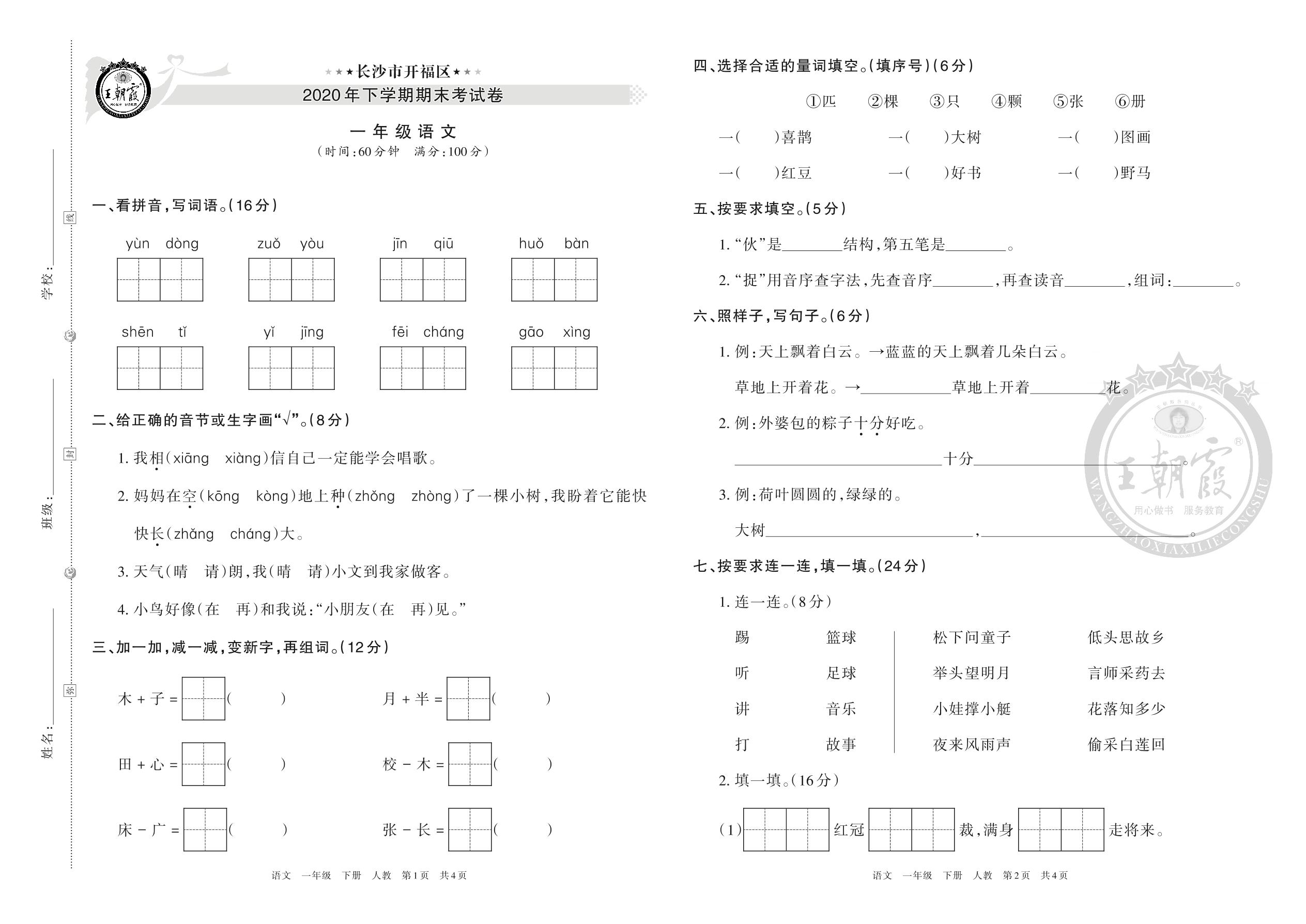 长沙市开福区2020年下学期期末考试卷一年级语文(人教版)