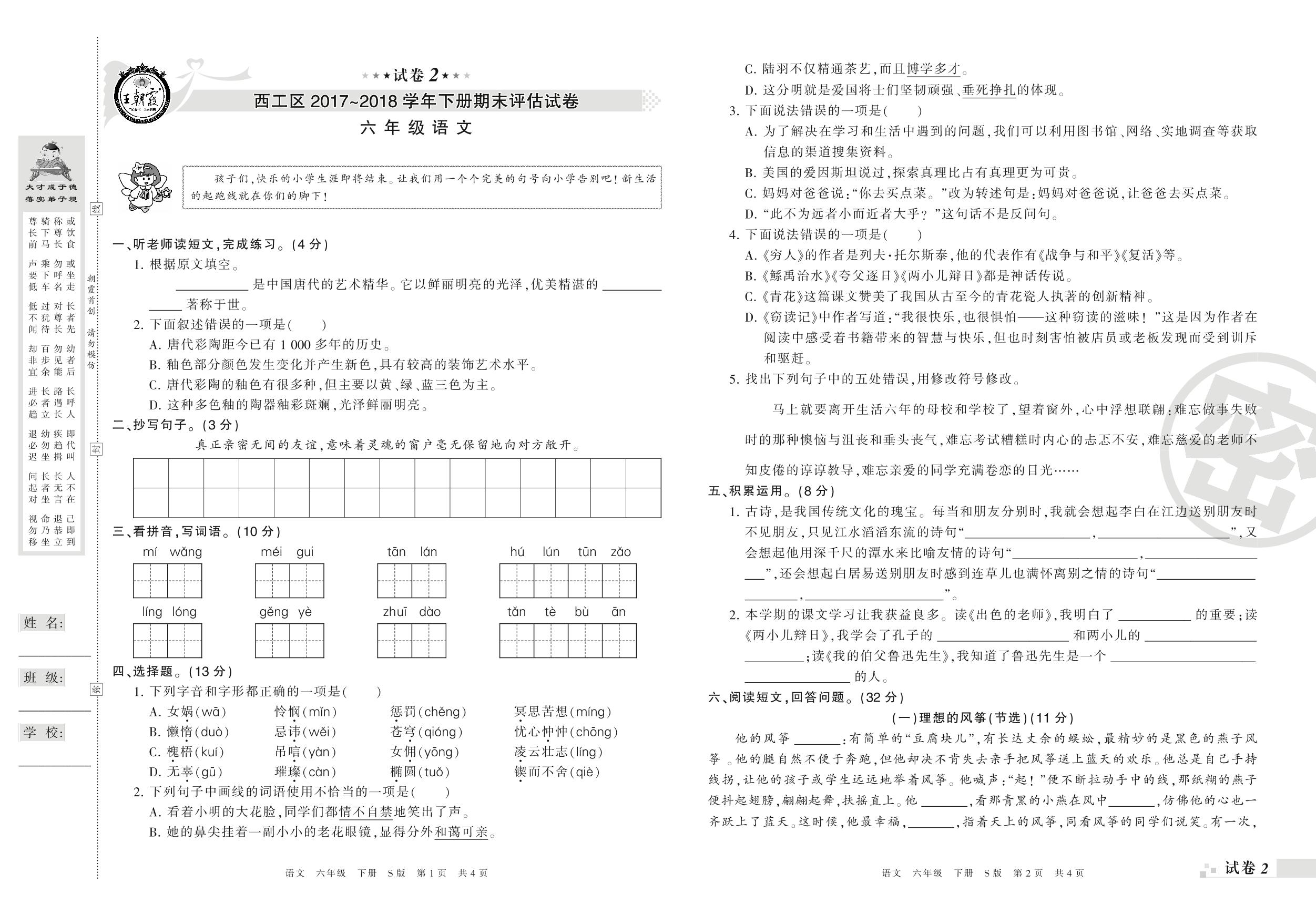 2017-2018学年第二学期洛阳市西工区六年级语文试卷(S版)【2】
