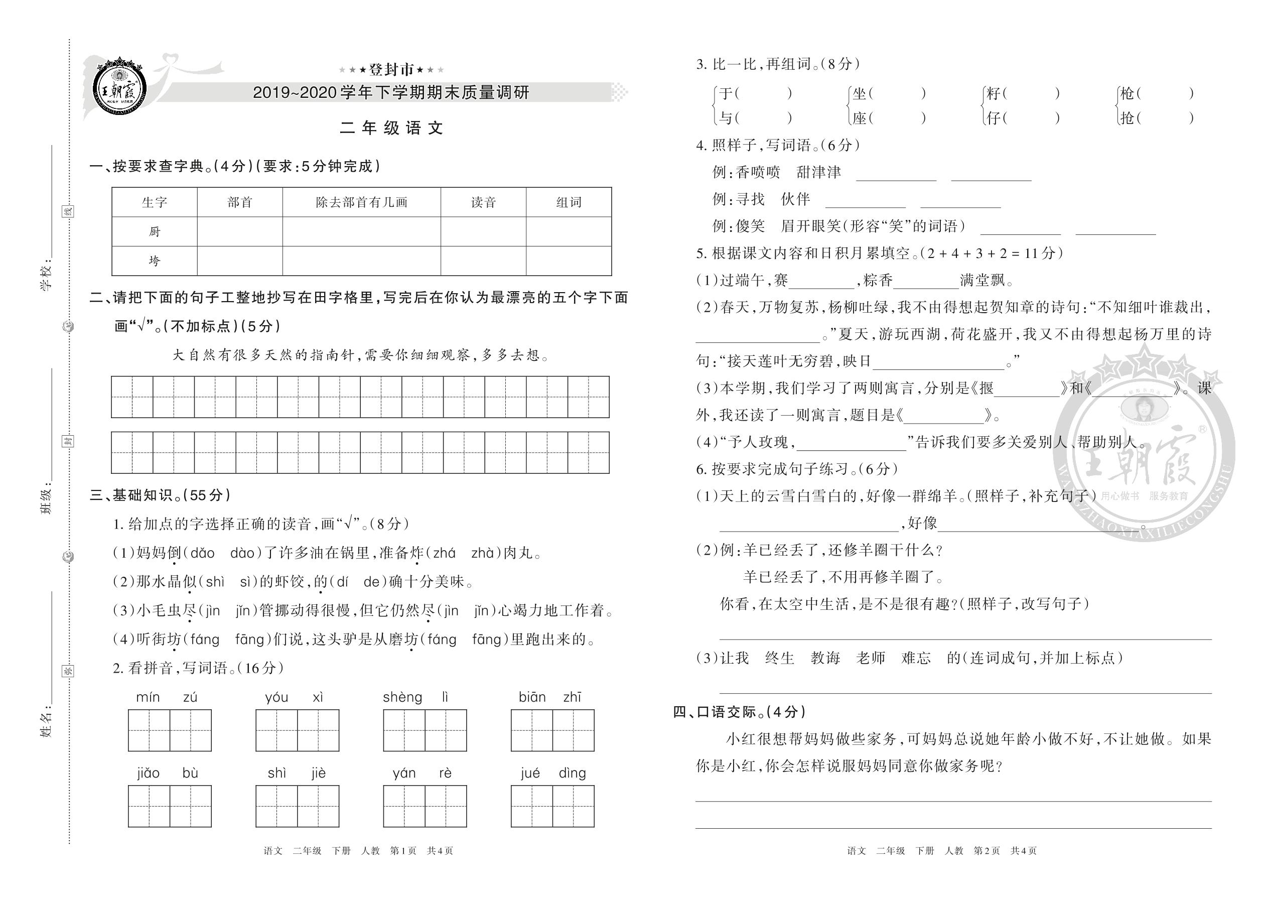 登封市2019~2020学年下学期期末质量调研二年级语文(人教版)