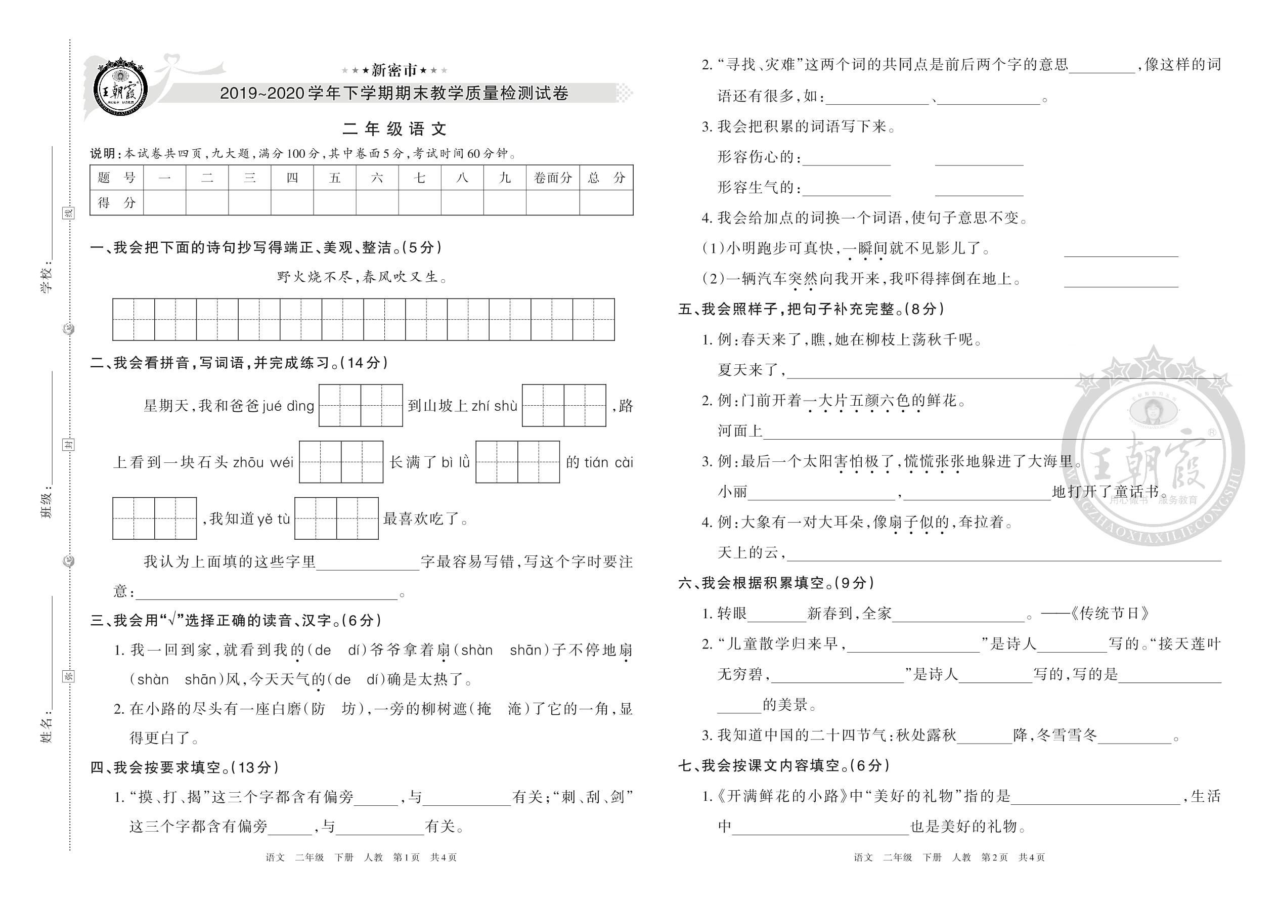 新密市2019~2020学年下学期期末教学质量检测试卷二年级语文(人教版)