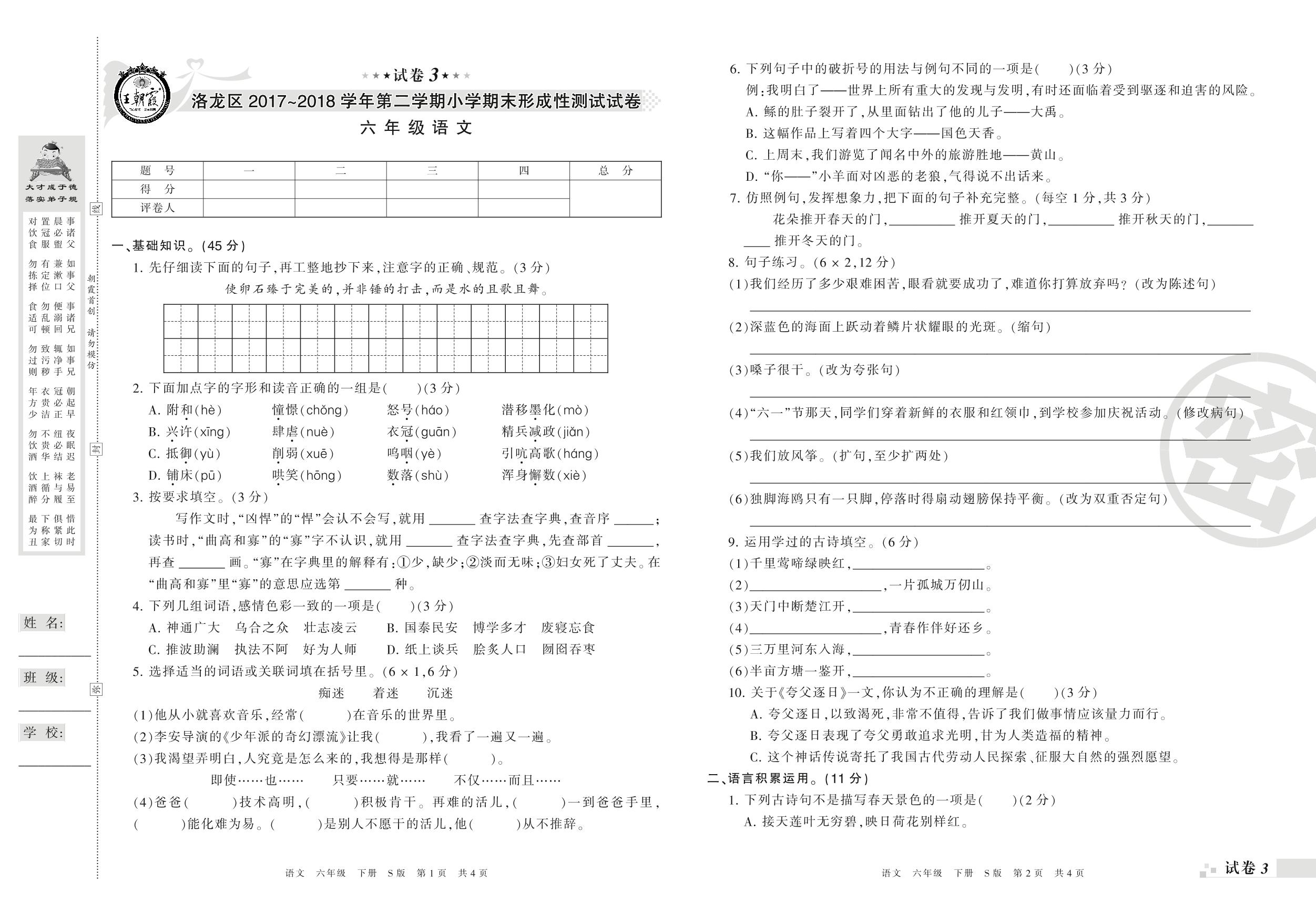 2017-2018学年第二学期洛阳市洛龙区六年级语文试卷(S版)【3】
