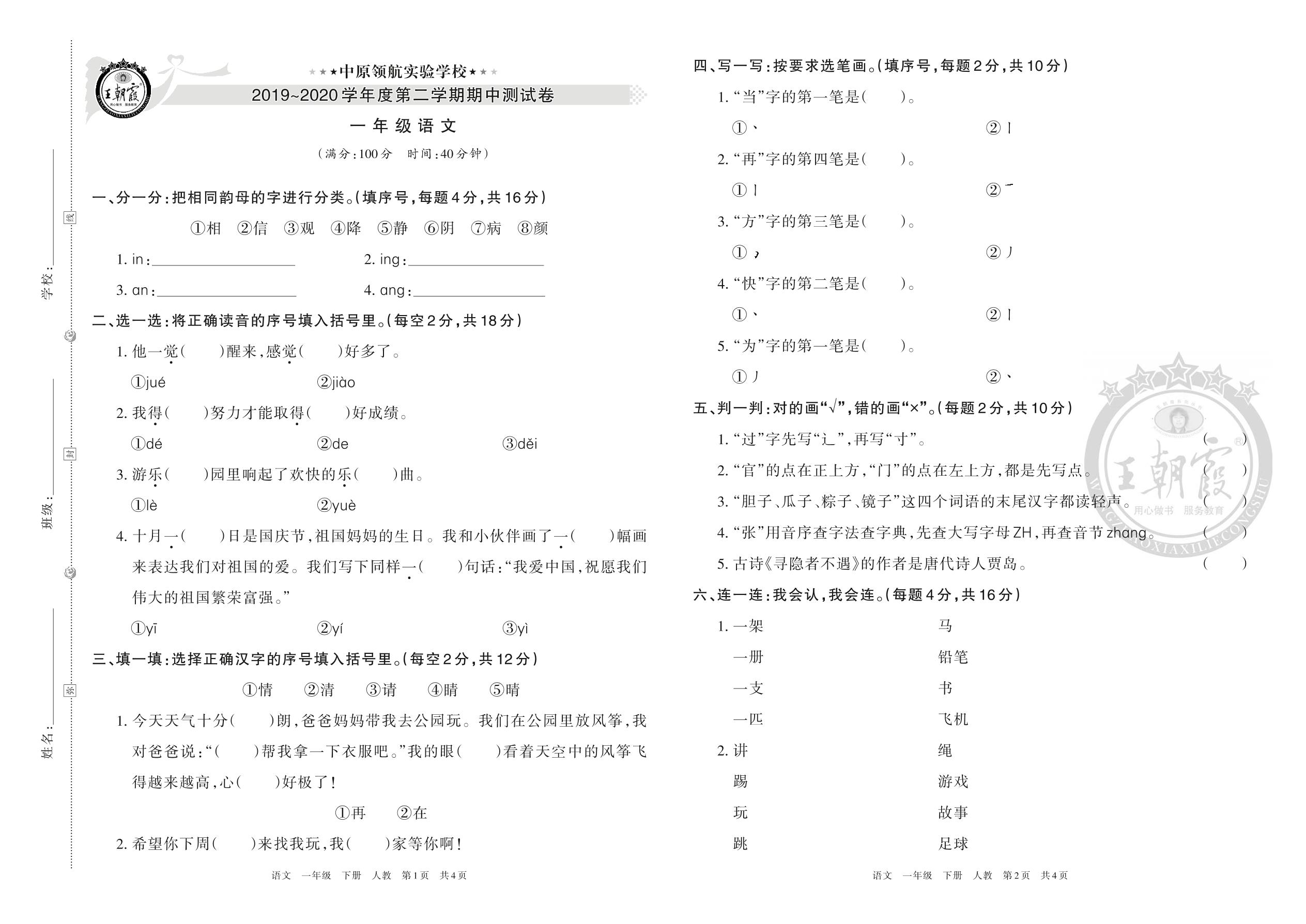 中原领航实验学校2019~2020学年度第二学期期中测试卷一年级语文(人教版)