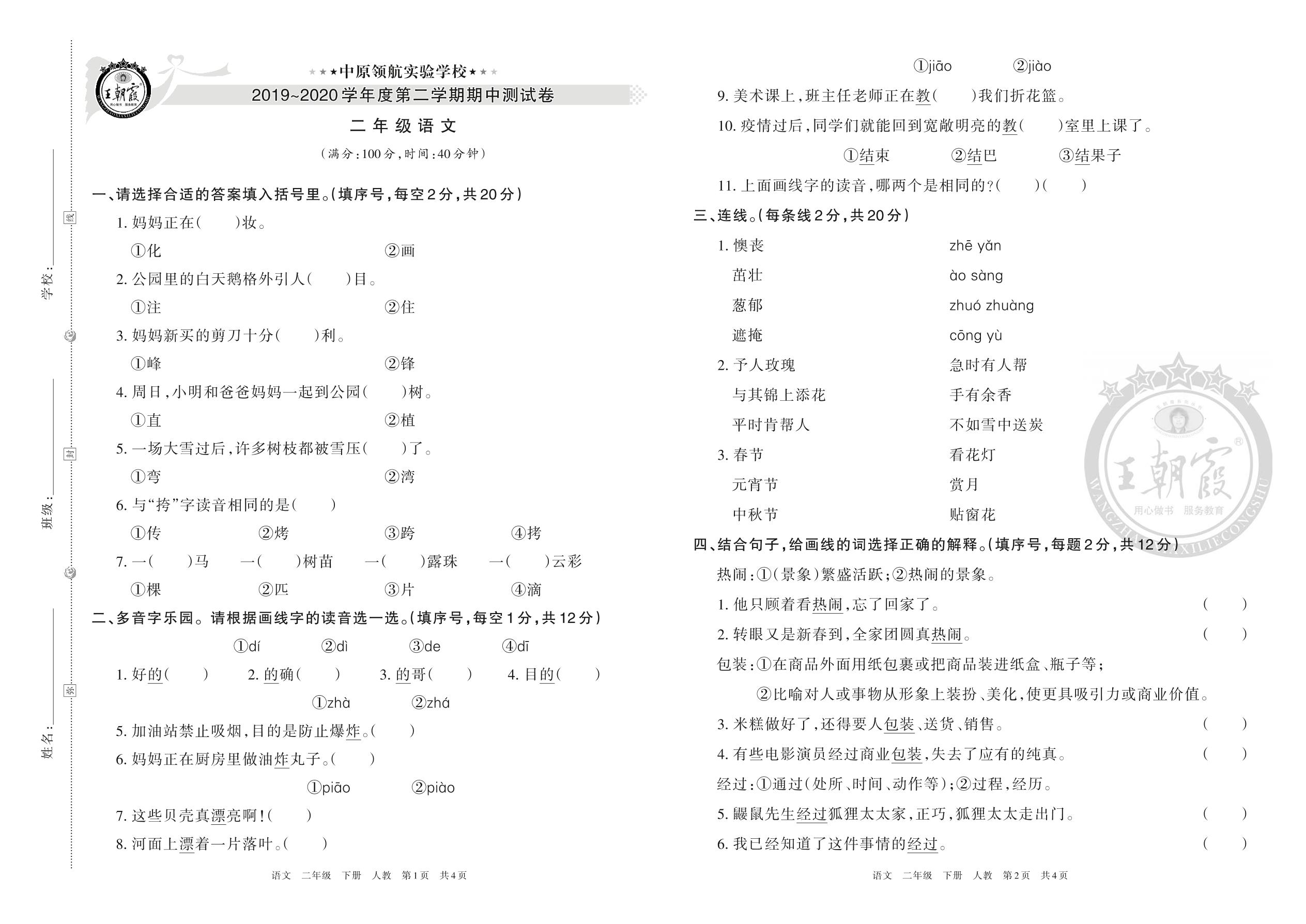 中原领航实验学校2019~2020学年度第二学期期中测试卷二年级语文(人教版)