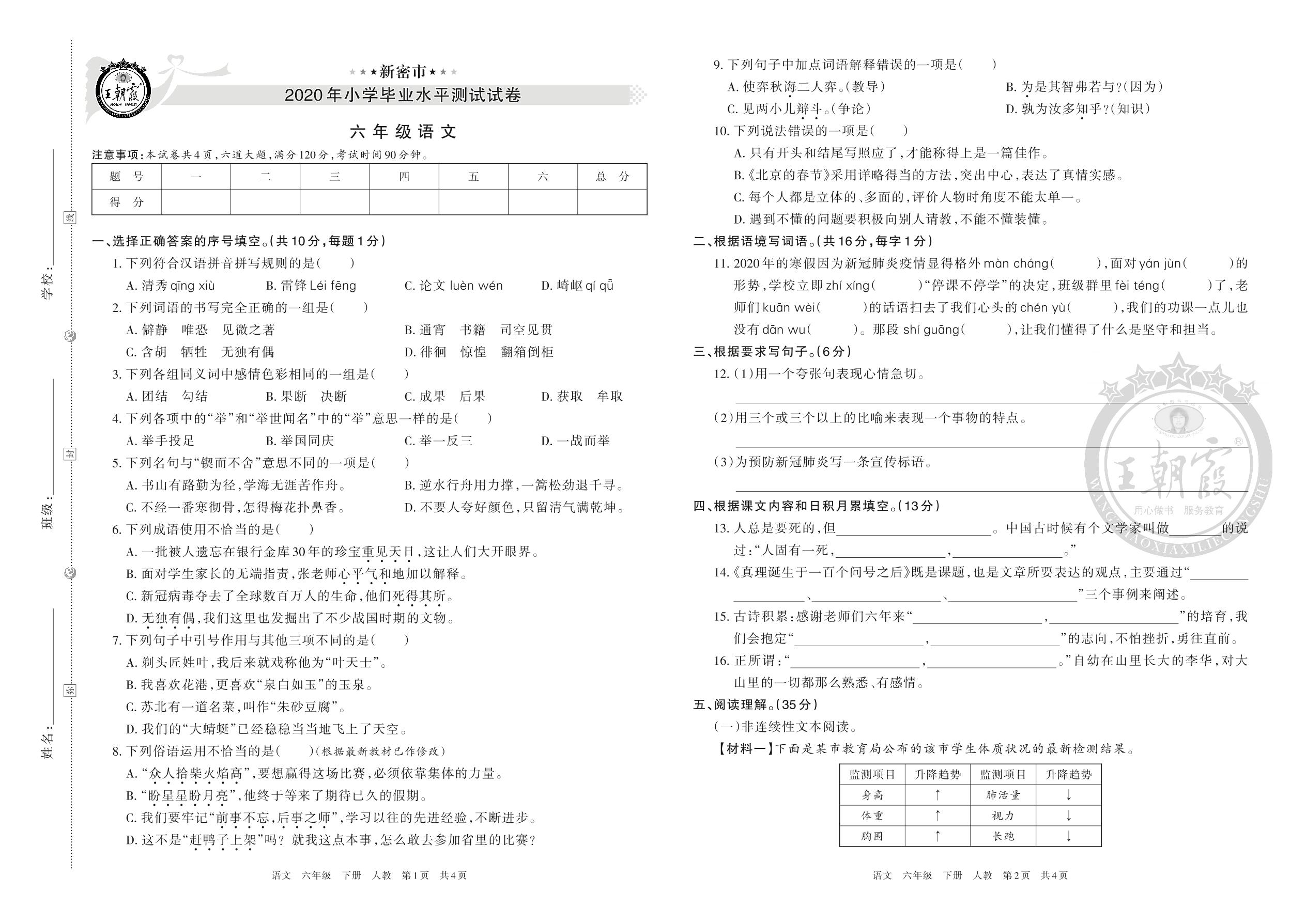 新密市2020年小学毕业水平测试试卷六年级语文(人教版)