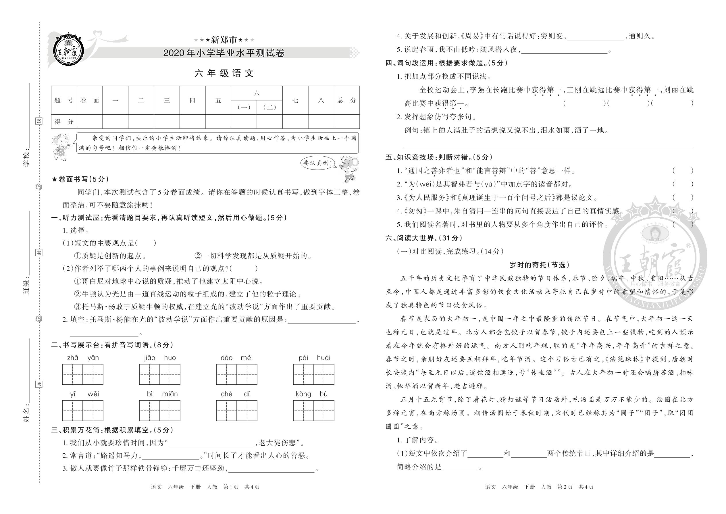 新郑市2020年小学毕业水平测试卷六年级语文(人教版)