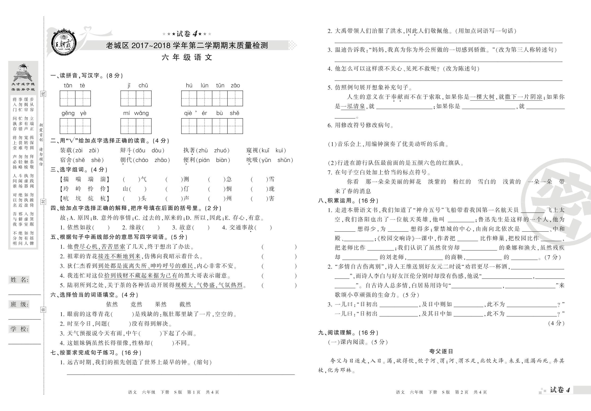 2017-2018学年第二学期洛阳市老城区六年级语文试卷(S版)【4】