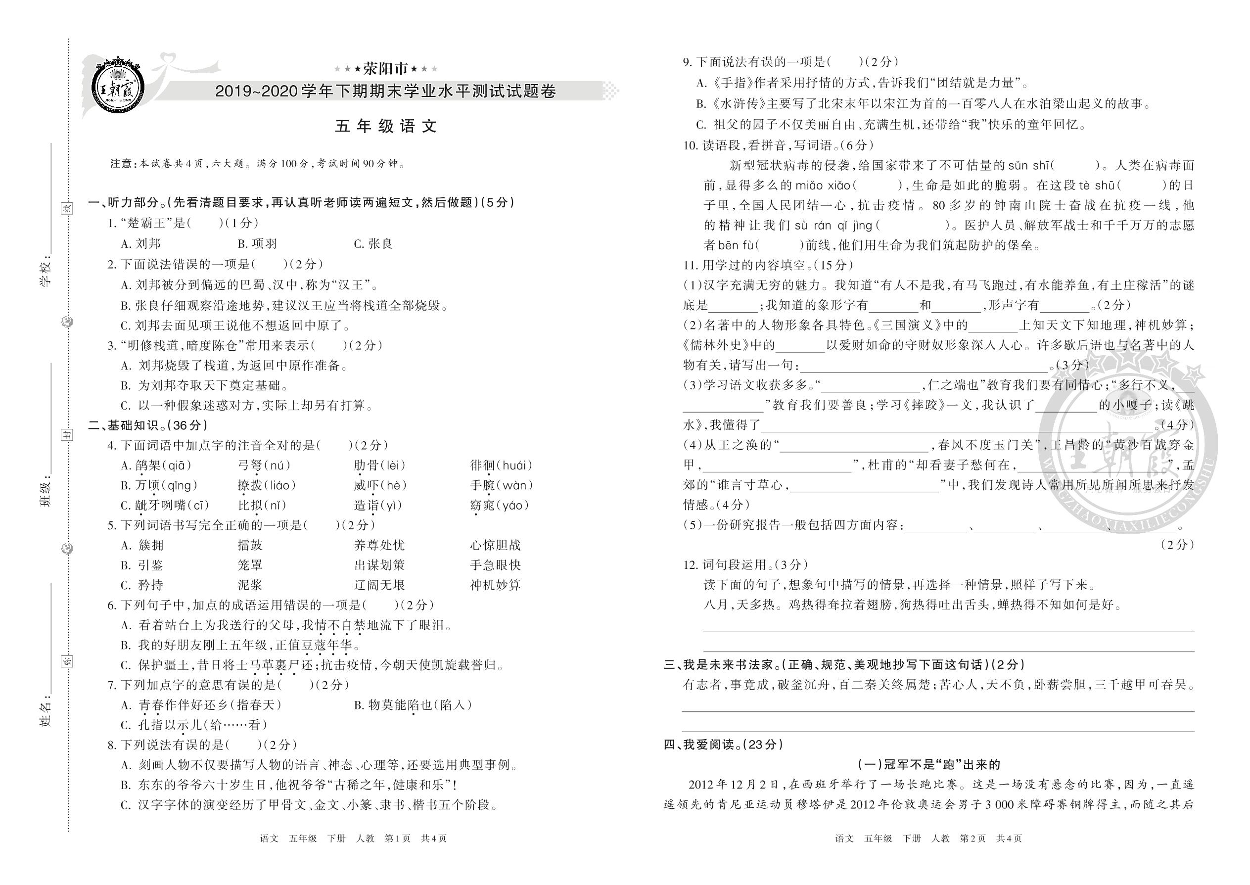 荥阳市2019~2020学年下期期末学业水平测试试题卷五年级语文(人教版)