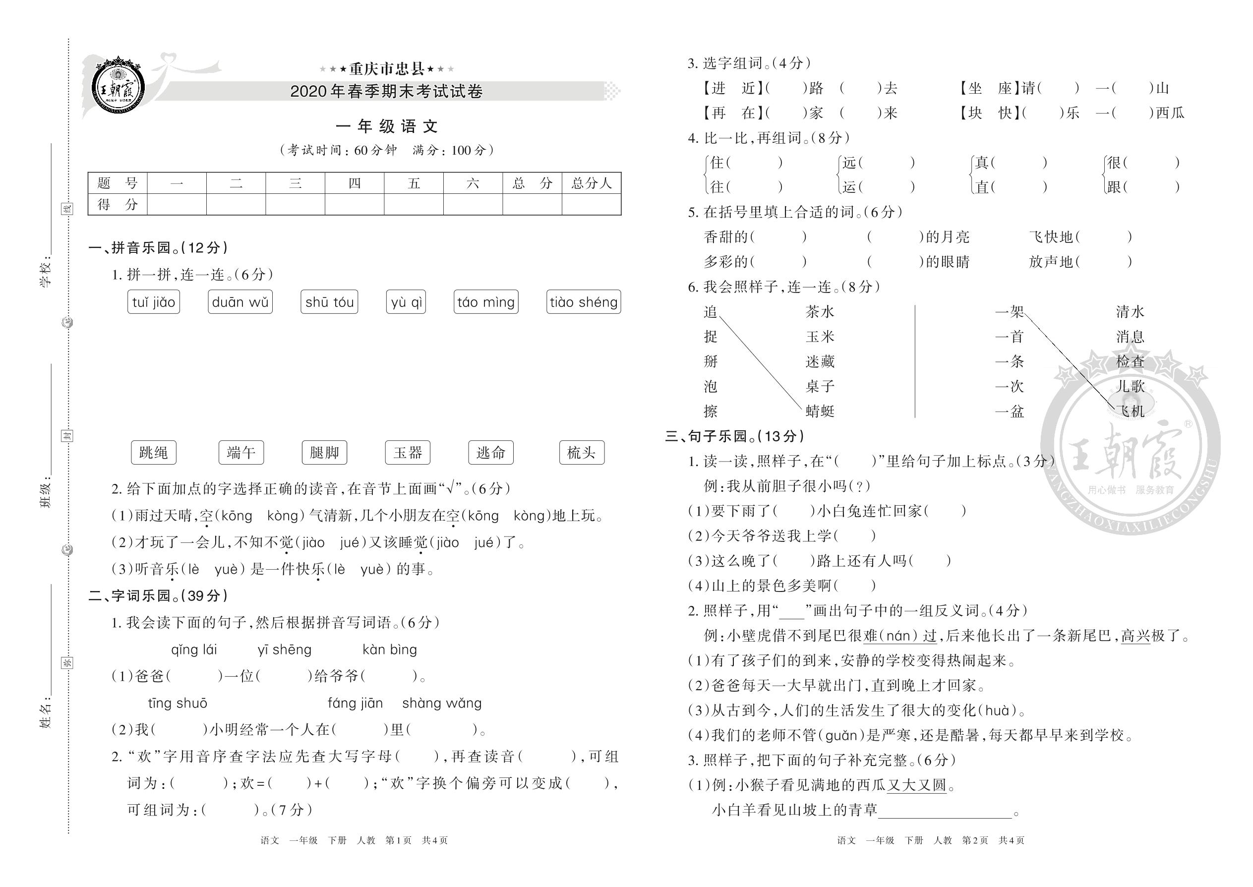 重庆市忠县2020年春季期末考试试卷一年级语文(人教版)